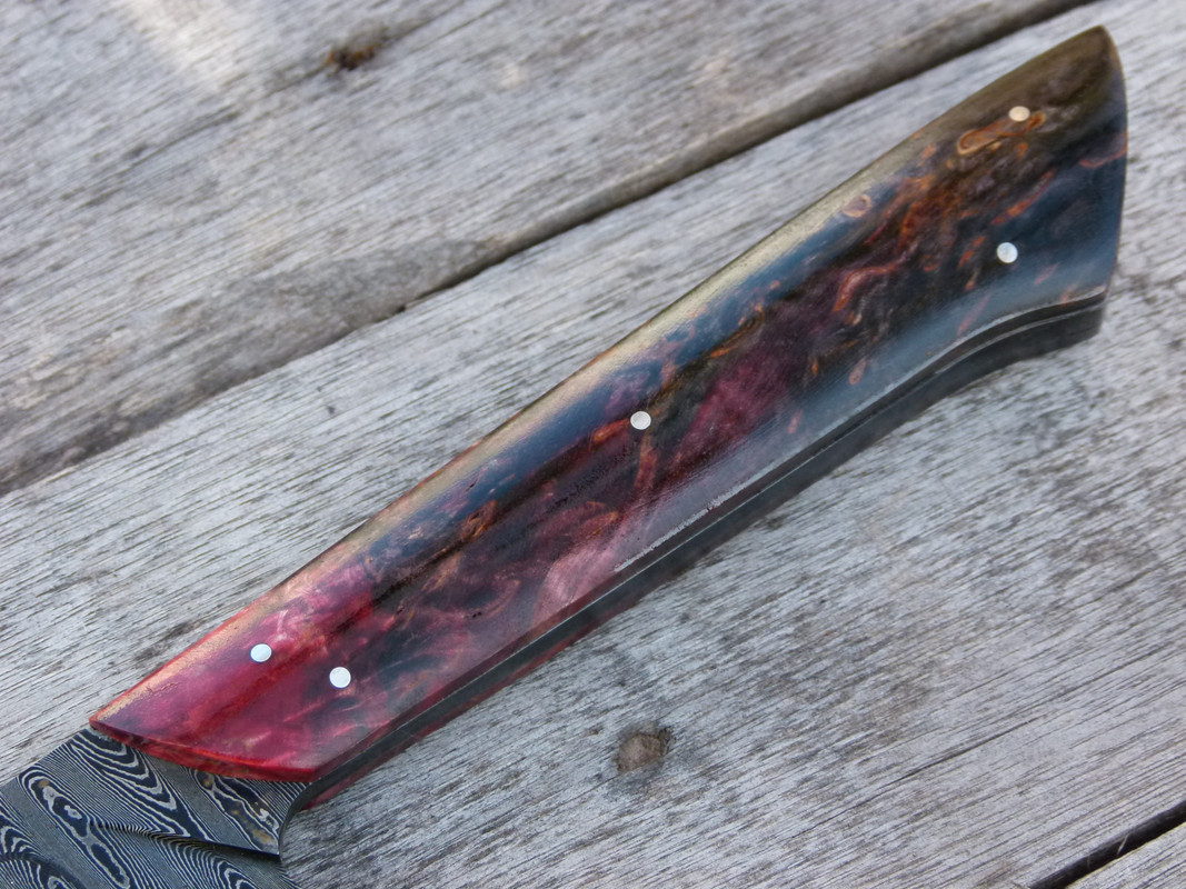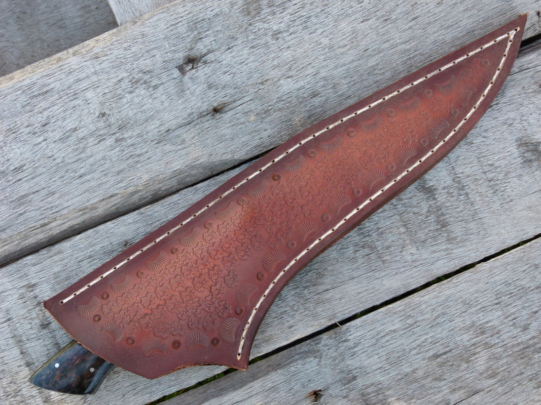 the wood is stabilized burl maple, the sheath is handmade leather.