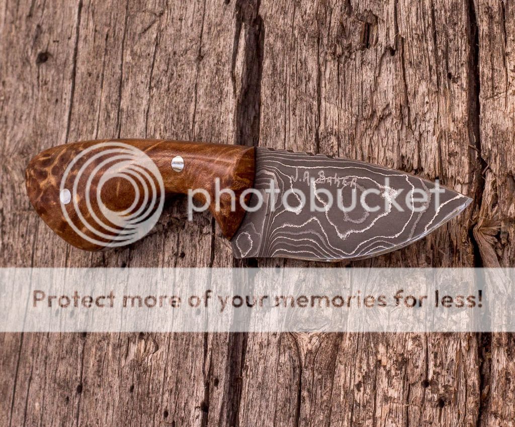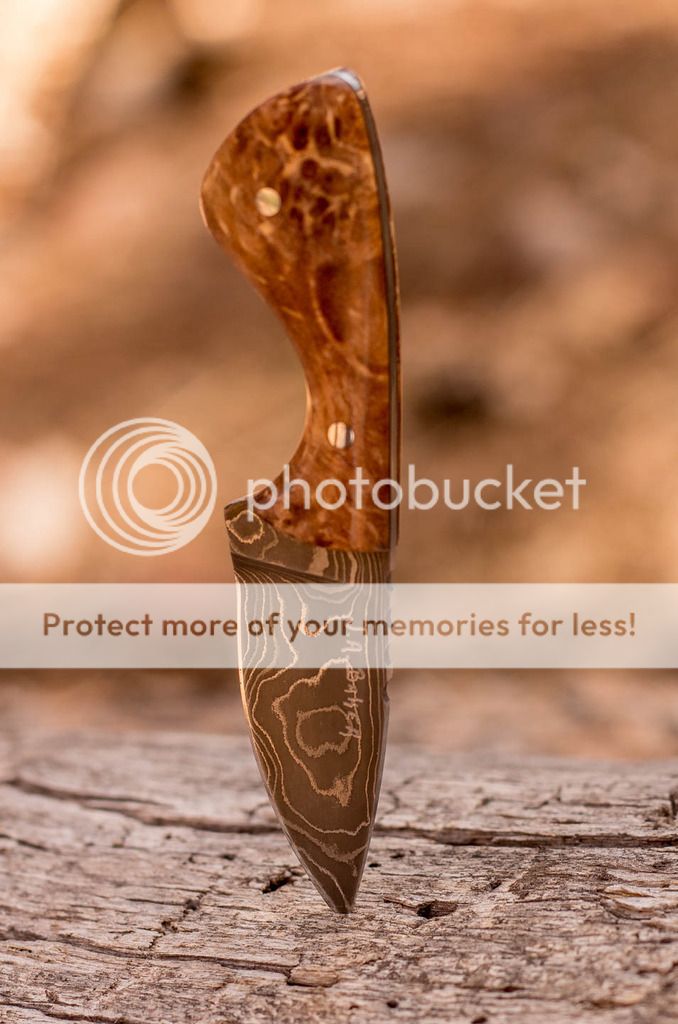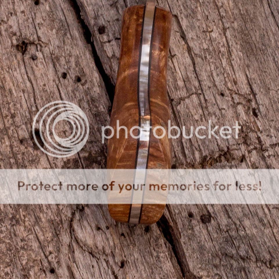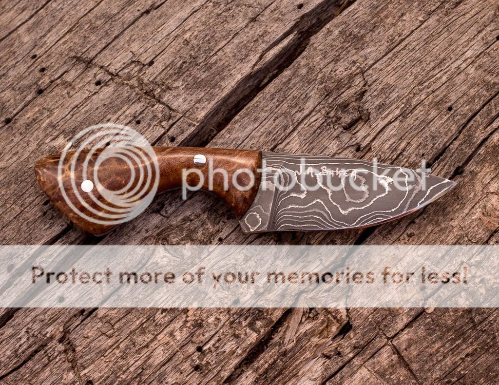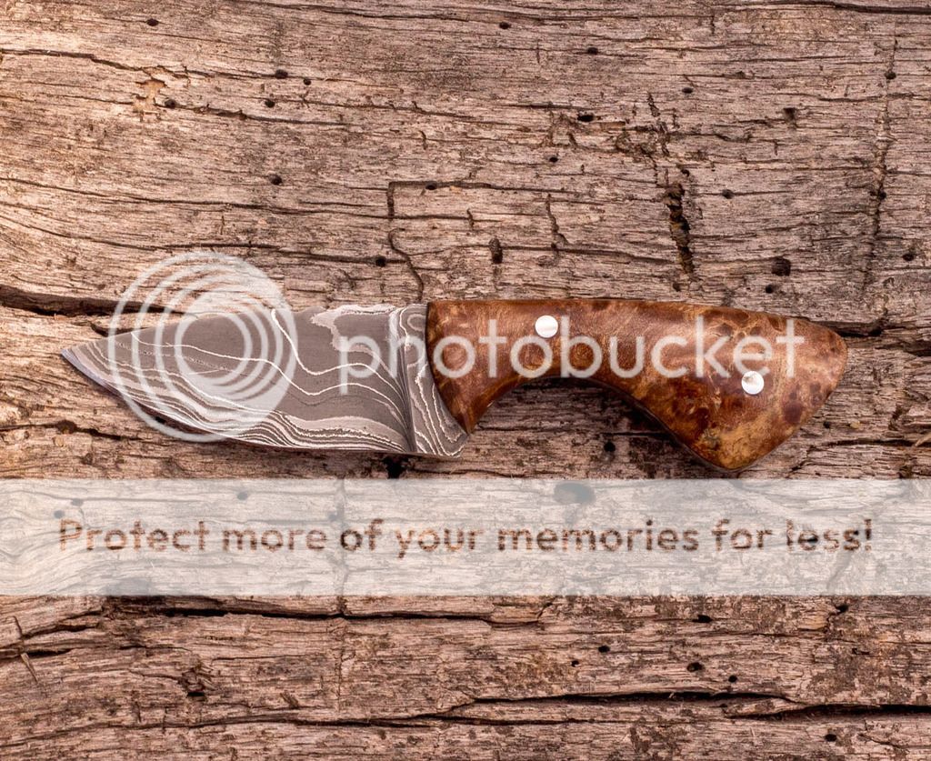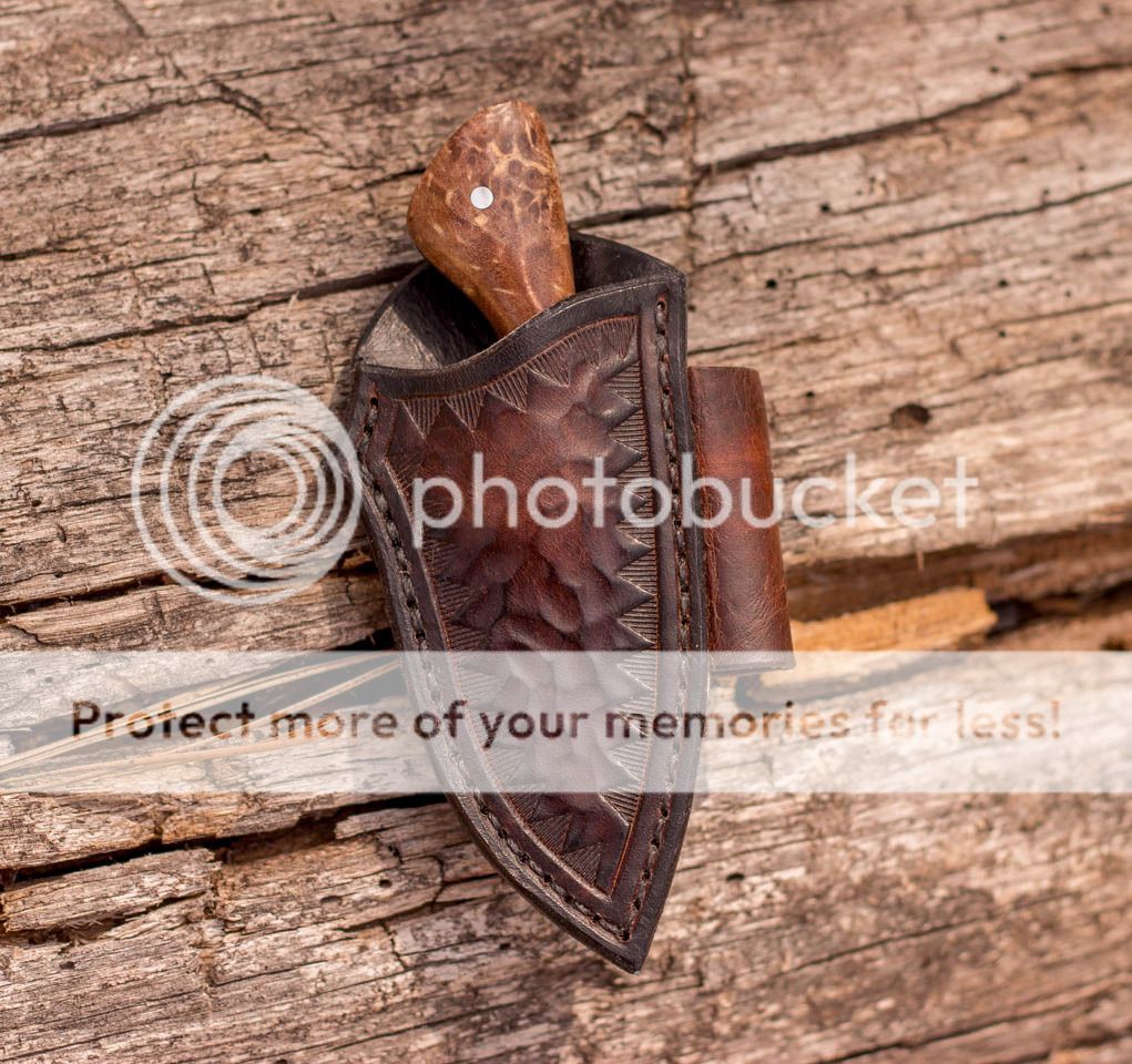 I have a small necker/pocket blade up for sale today. This one has a Damascus blade, stabilized figured maple scales with black spacers and has a tooled leather sheath set up for pocket or horizontal belt carry. A Kydex neck carry sheath can also be made for this. Prices listed below. Thank you for taking the time to check it out, Jeff.