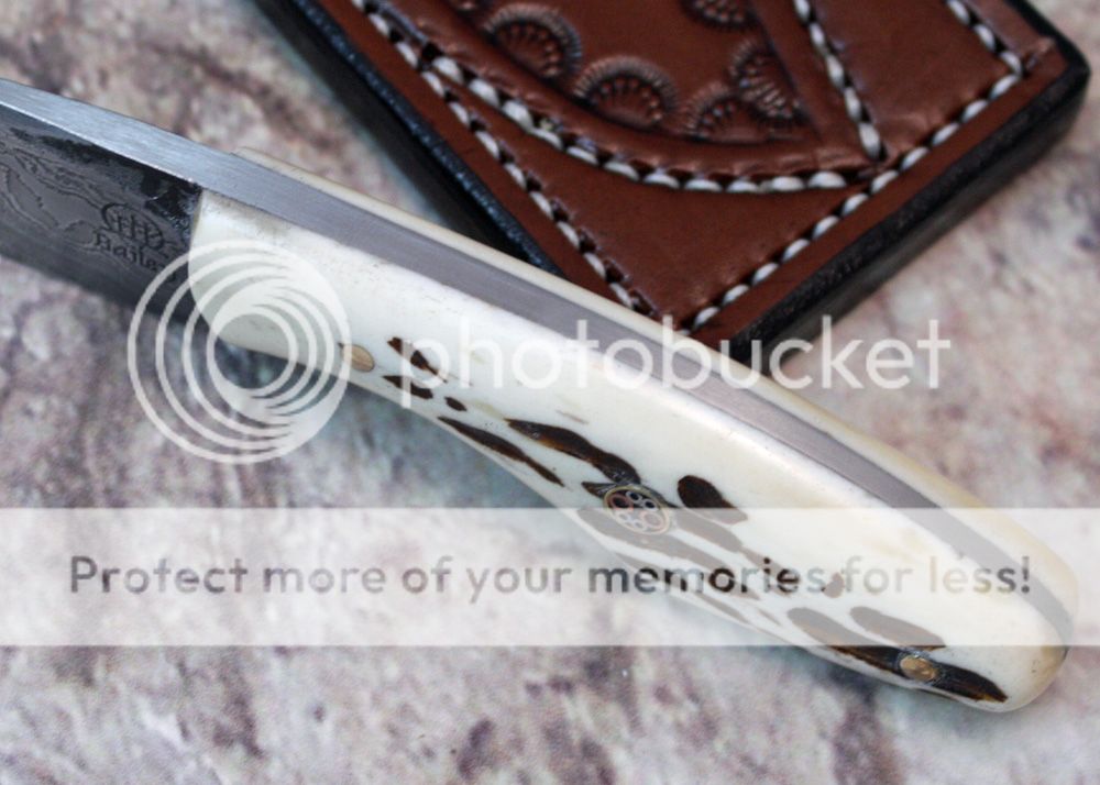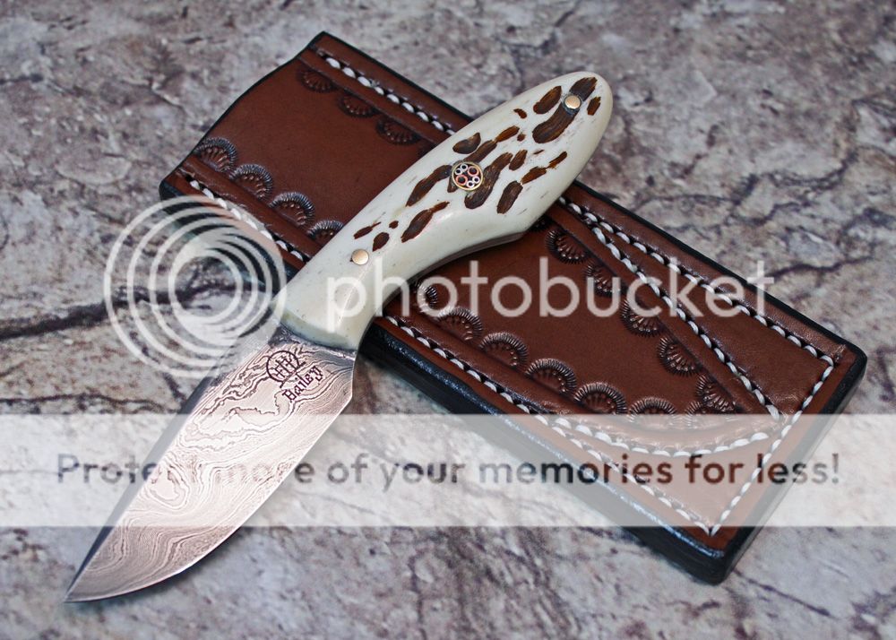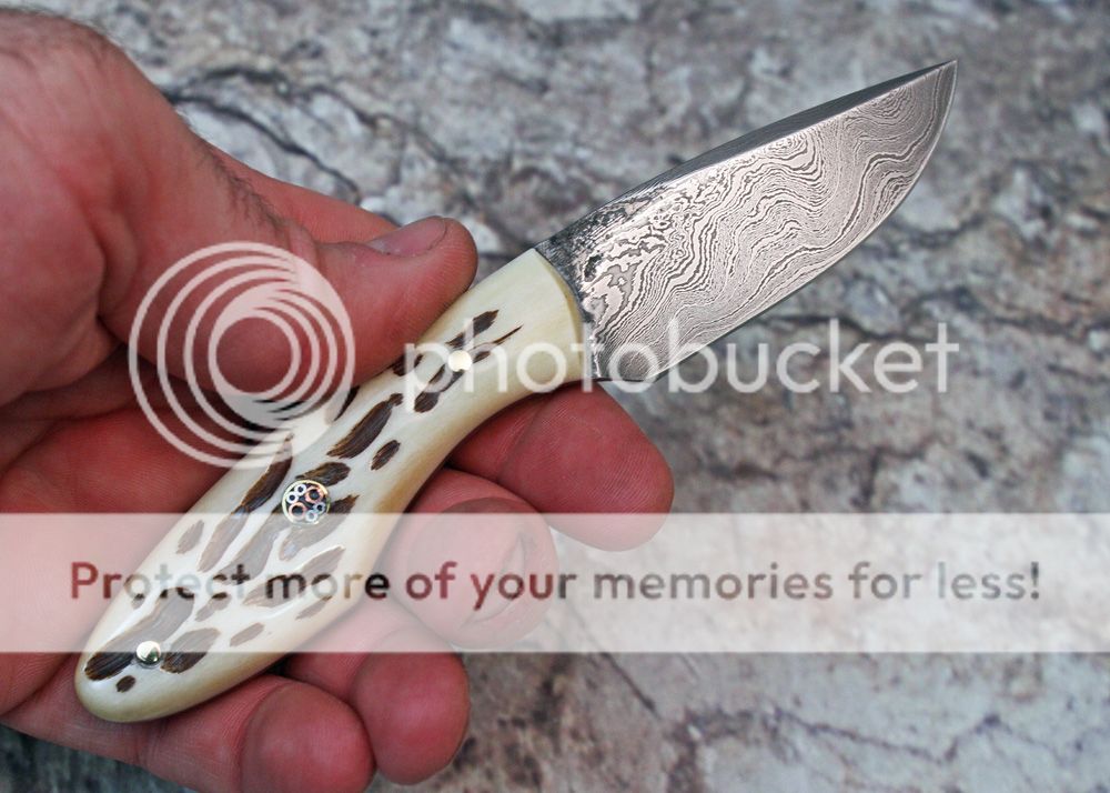 The handle is jigged bone that I jigged myself. It is held in place with G-flex epoxy and pins, including one mosaic. The handle fits in the hand well.