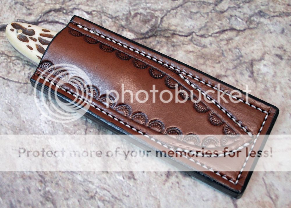 The sheath, as mentioned before, slips in the pocket nicely. It holds the knife well, and pops out nicely. It is 7-8oz leather from Wickett and Craig. It is hand tooled.