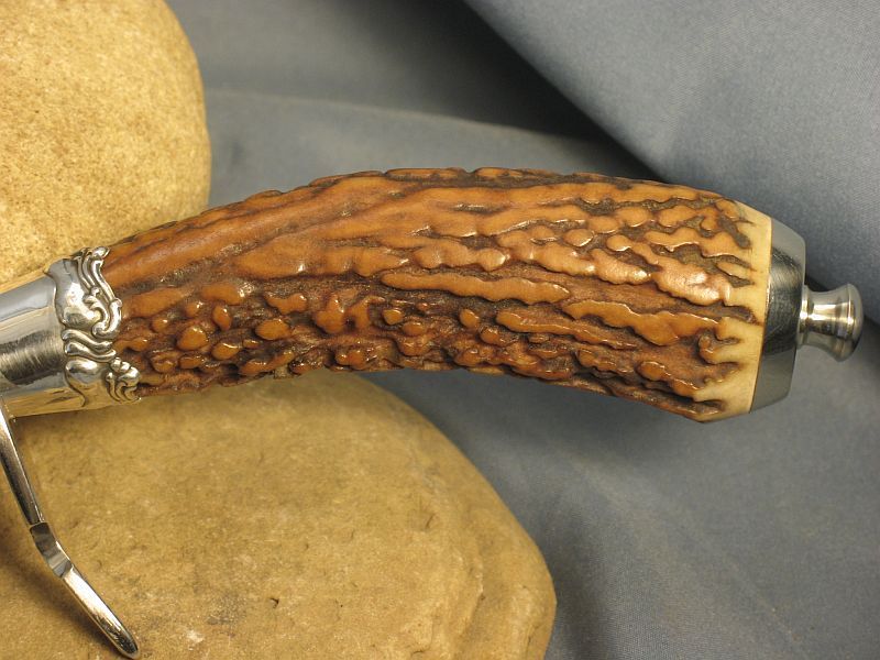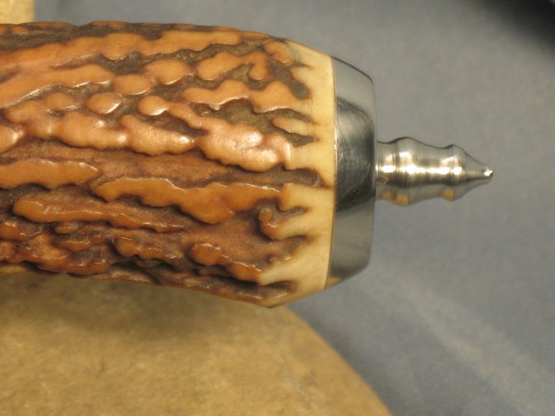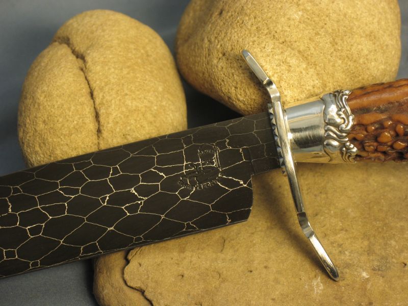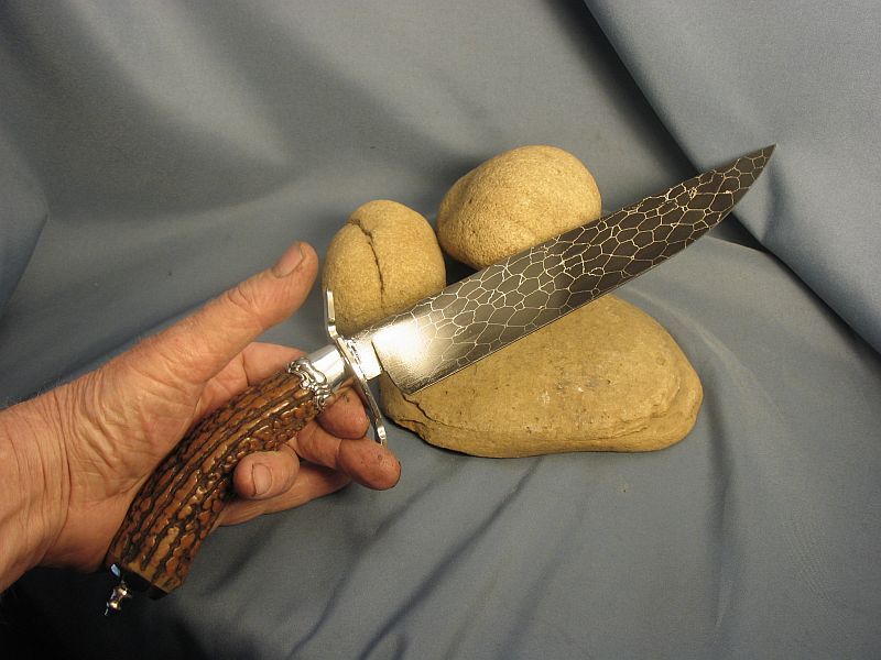 Nice Bowie or fighter with a fine cut of Amber India stag. Skull crushers can be unscrewed and changed. One is pointy and the other is rounded. Check photo's and see them. Ferrule is sterling silver and other fittings are nickel silver. It has a 9 3/8 inch blade and is 14 3/4 inches over all. Damascus steel is 52100 ball bearings I had nickel plated then forge welded to make the billet. Sheath included. Sharp. I would like "SOLD " and 15.00 for priority mail in USA. My e-mail and paypal address is dangraves4923@earthlink.net