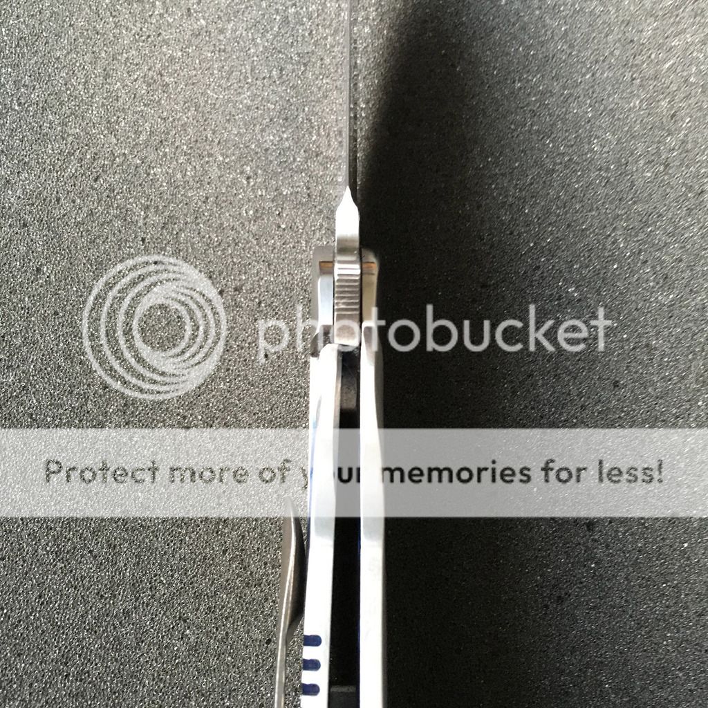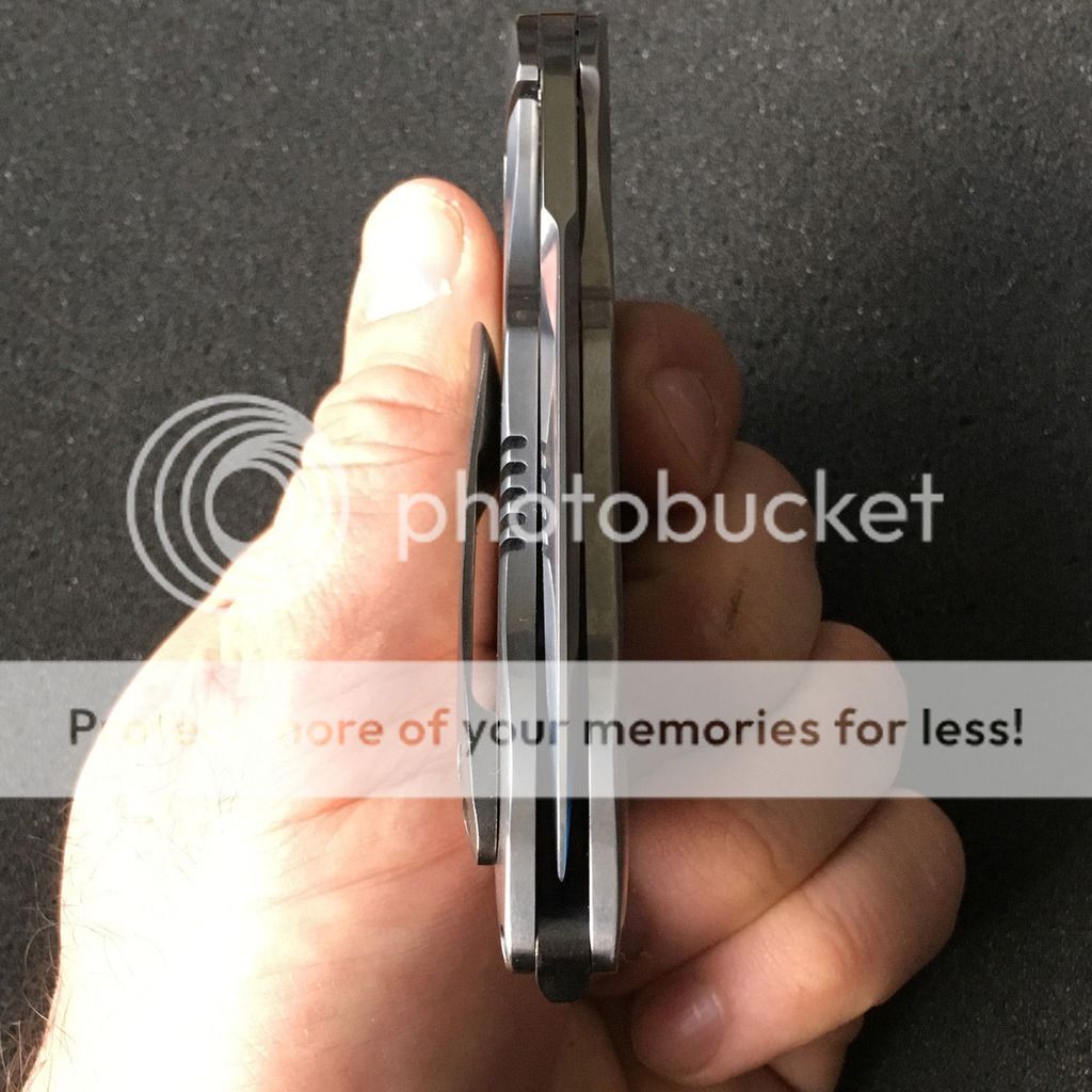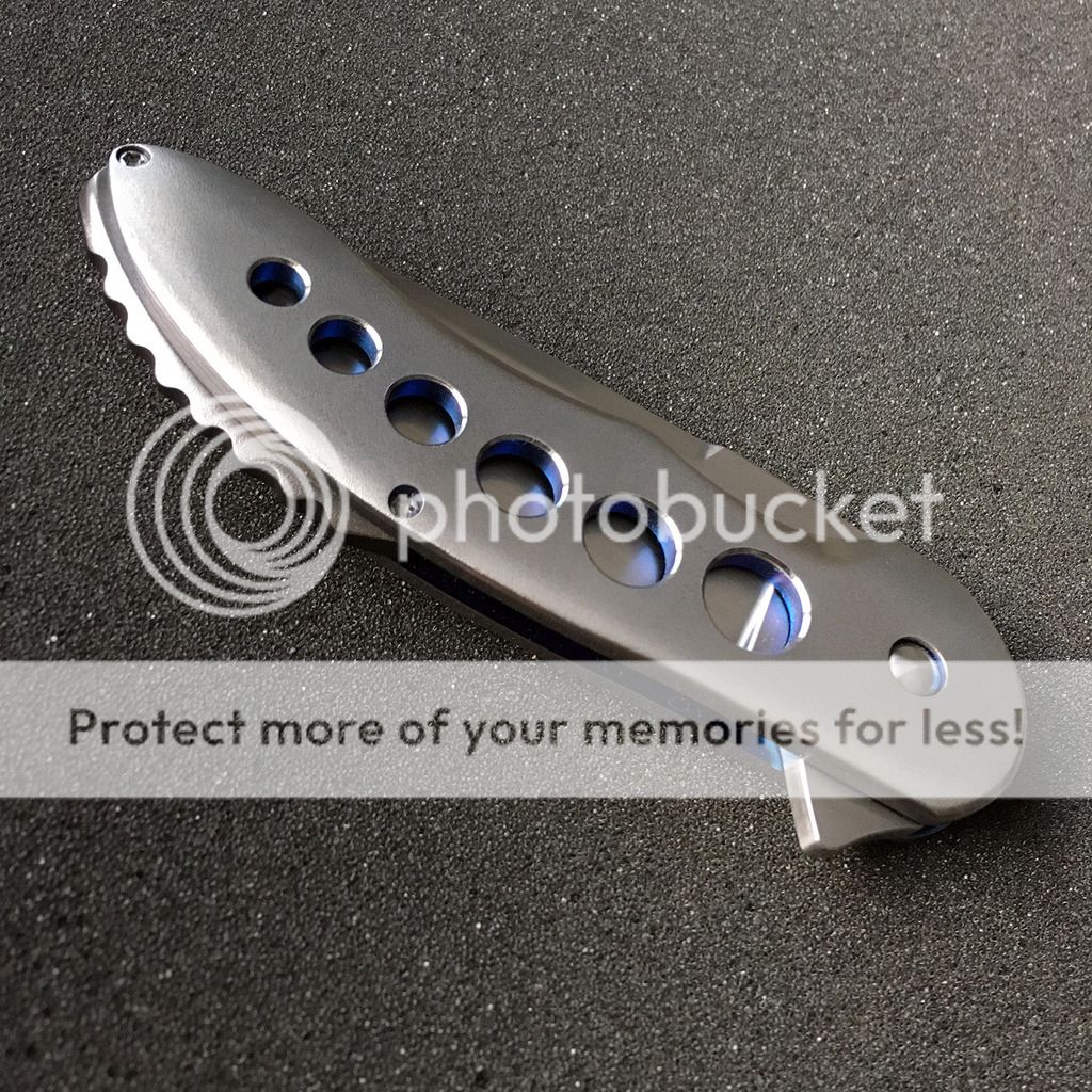 This knife is unbelievable: so incredibly smooth and just amazing details. It has blue anodizing inside the frame which subtly shows through the edges of the chamfered holes. Drops closed without any effort. No lock stick or anything and one of the nicest customs Ive handled so far. The clip and backspacer are blackened titanium and almost look like zirc although you can't tell from my pics. It is mint and unused aside from flipping a few times. Soft pouch included.