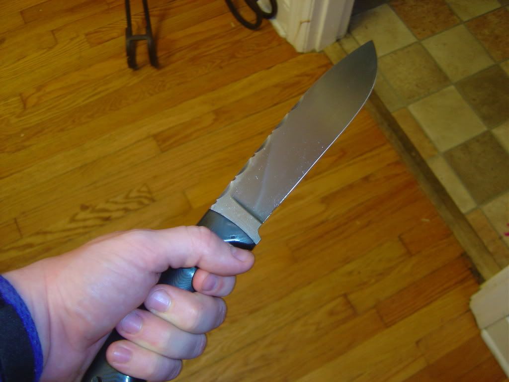Here is a Dan Koster Monster Nessie I picked up. 1/4 inch 5160 with cocobolo scales. Sheath is one I made, not pretty, but it works. In hand pic to show how huge this thing is.