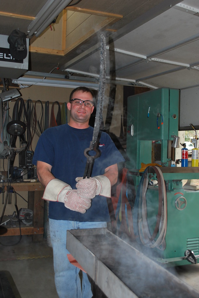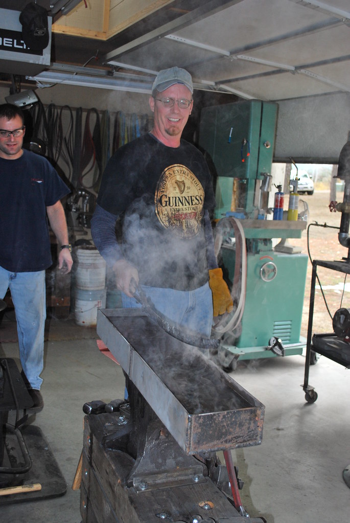 I recently had the opportunity to forge my first wakizashi. Dan Pfanenstiel came up and walked me through the process. I used Don Hanson W-2 and Dan used W-1. I've cracked lots of small W-1 blades in water so I was almost certain this one was headed for the trash. I can't explain the feeling of seeing a straight blade going into a water quench and having it come out curved other than FREAKIN COOL!