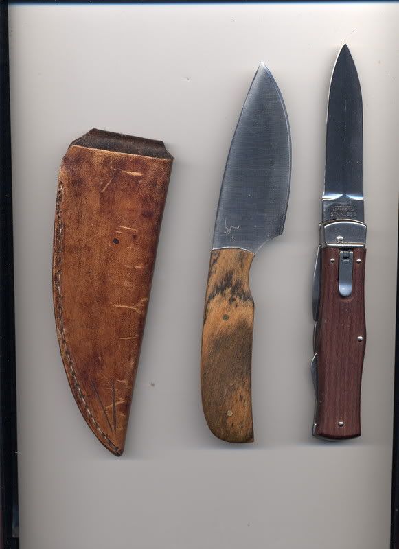 1. David Farmer hunting knife. This knife is new, never used. Blade length is 4 inches. Cutting edge is about 3 1/2 inches, width is just over an 1 1/4 inches. Overall length is just under 8 1/4 inches. The handle material is Bocote. Steel is 1095 carbon. Comes with a leather sheath. *TRADE PENDING*