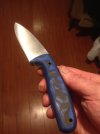 This one is in 3/32" AEB-L, at 62 RC. 9" overall, 4 3/8" cutting edge, and weighs in at 5.1 oz. Handle is blue and black Suretouch™, where the blue is G10, and the black is rubber. I experimented with a new texturing method, and I like the results. Before I post another R&D knife here, I will make a point to provide a performance review, and possibly some cutting footage.