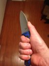 This one is in 3/32" AEB-L, at 62 RC. 9" overall, 4 3/8" cutting edge, and weighs in at 5.1 oz. Handle is blue and black Suretouch™, where the blue is G10, and the black is rubber. I experimented with a new texturing method, and I like the results. Before I post another R&D knife here, I will make a point to provide a performance review, and possibly some cutting footage.