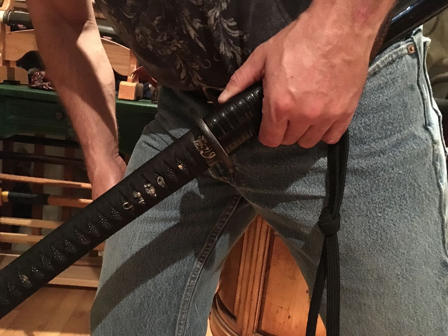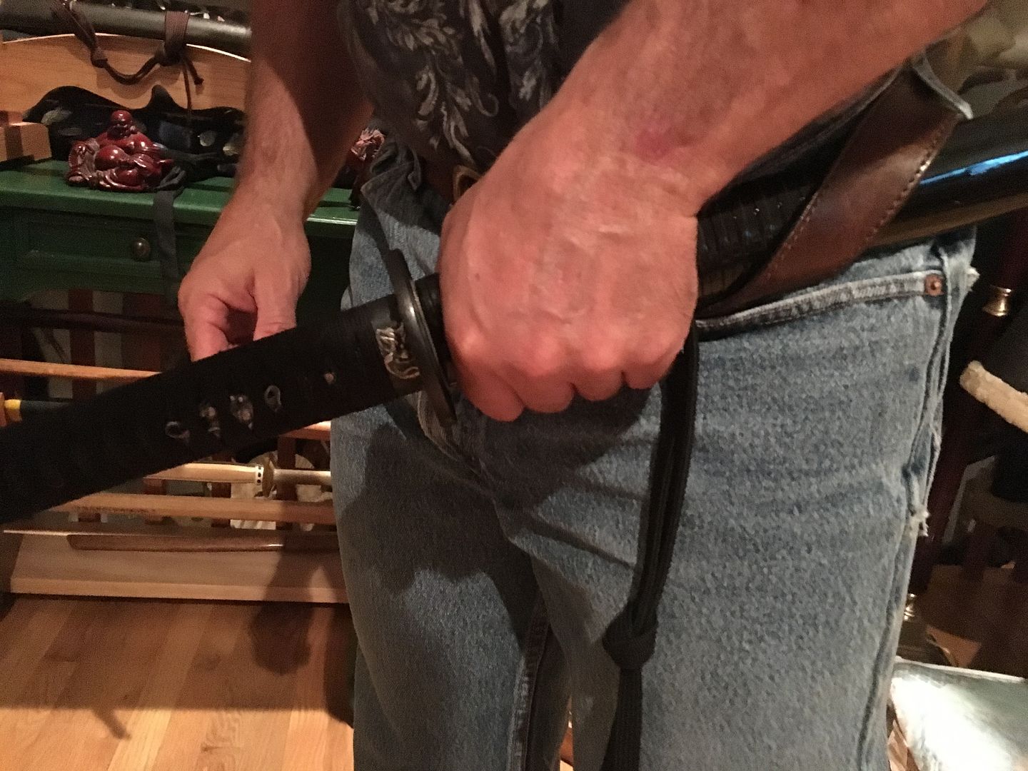 After breaking the seal with my thumb I than depending on what angle I want to draw the sword to facilitate the cut roll the sword controlling the SAYA with my weak hand while drawing with my right
