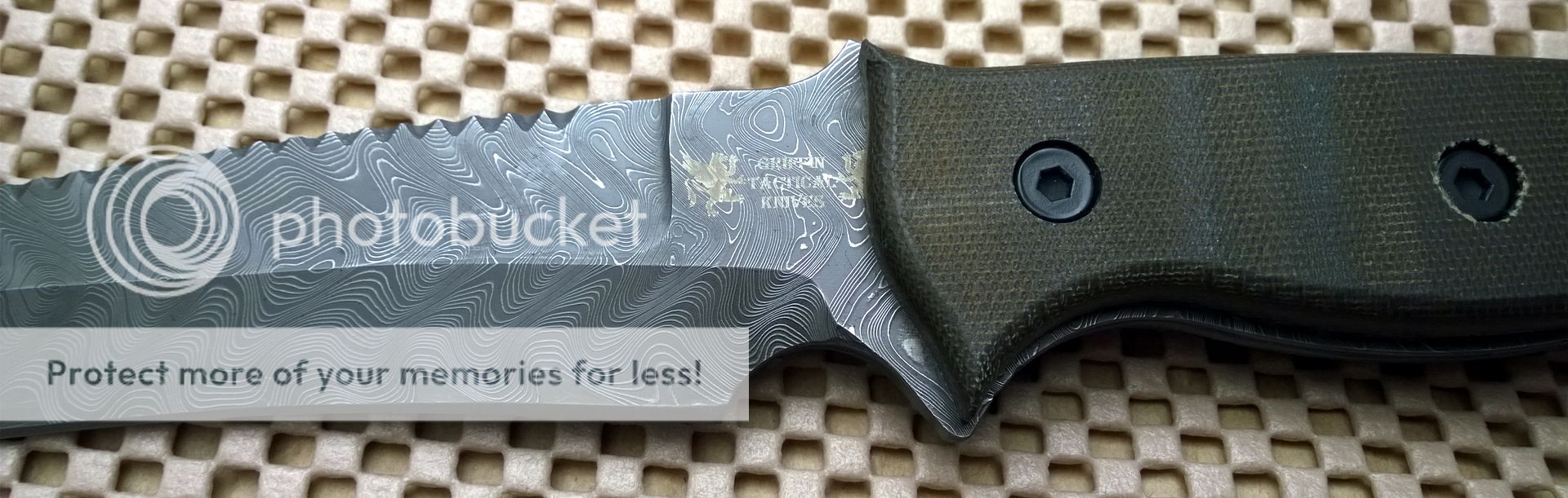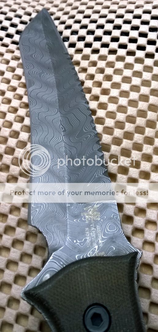 This knife comes with a couple upgrades from the maker, first and foremost of which is the Chad Nichols Stainless San Mai Damascus (a $250.00 up charge) as well as the para-cord lanyard and the serrations (an additional $40.00 up charge). Bringing the Makers Retail Price to : $589.00 plus shipping.