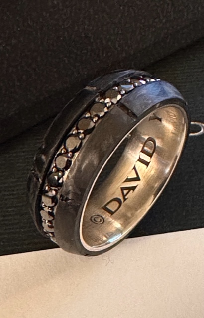 David Yurman forged carbon ring with black diamonds, 8.5 mm wide, size: 10, worn for three weeks or so… $2100 retail, this is $695… NOW $SOLD shipped in the US.