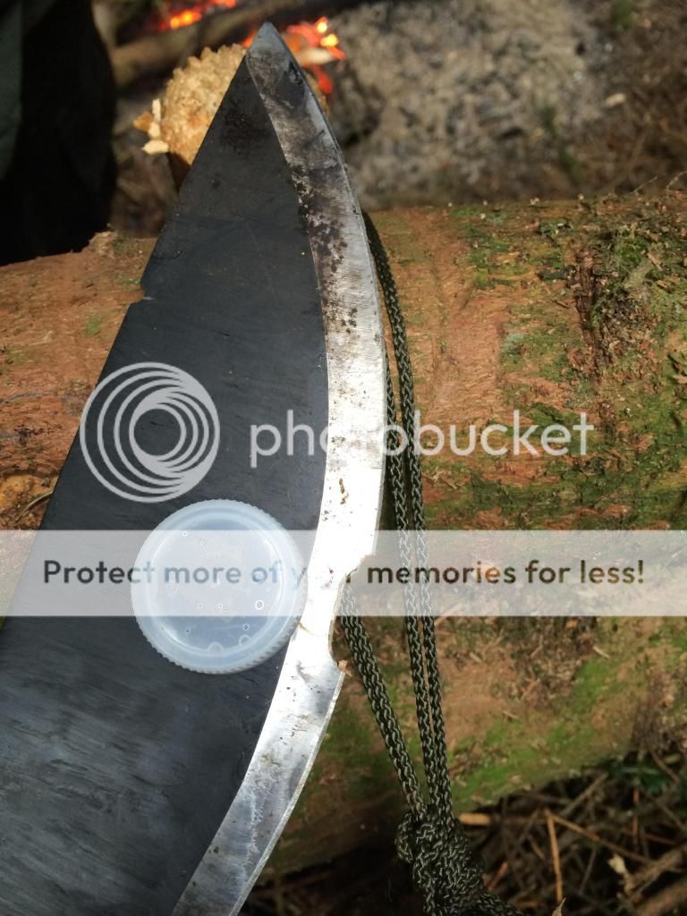 I'm not a small guy and through height and weight (6'4", 230lbs) I can get a fair bit of power into my swings, this allows me to lop off some thickish branches fairly easily. However the woods we were in are pretty hard and the toffee/caramel coloured bits at the base of branches were the hardest wood I've ever cut. I never felt the blade chip out or even heard it. I just looked down and thought "that doesn't look right". The chip was abut an inch long, maybe a 1/4 inch high.