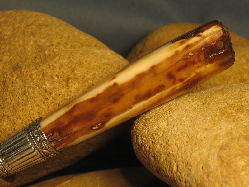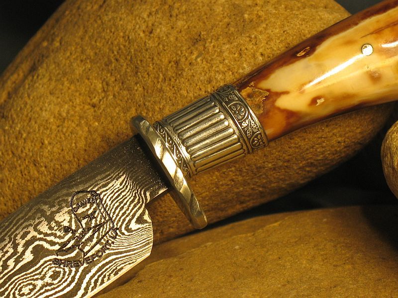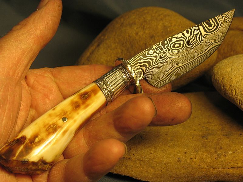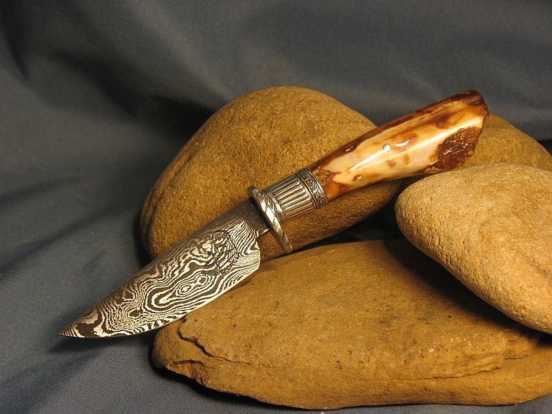 You can decide which it should be. Guard and pin are nickel silver and ferrule is sterling silver. My Damascus of 1080 and 15n20 with fossil Walrus Ivory. Blade length is 3 1/4 inches and overall length is 7 inches.