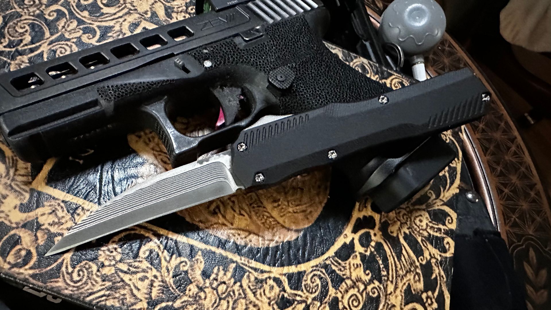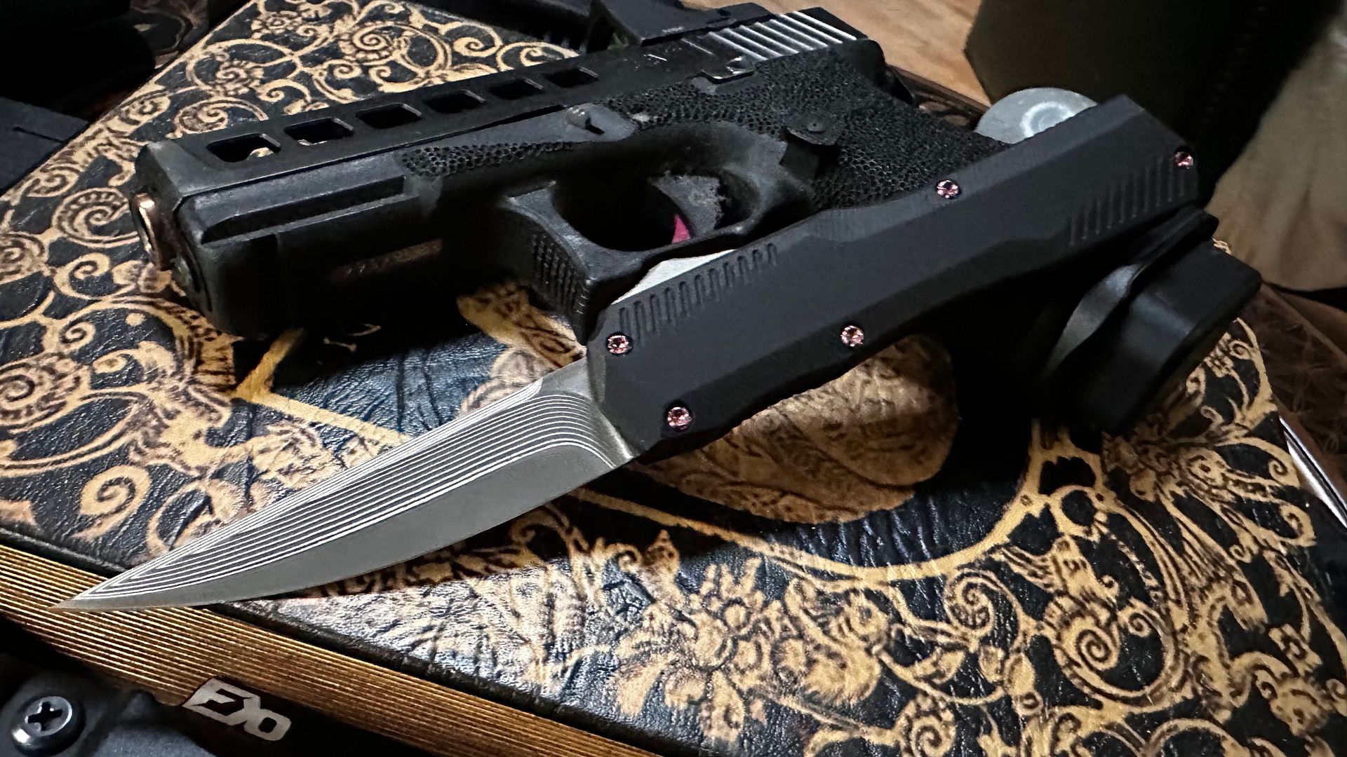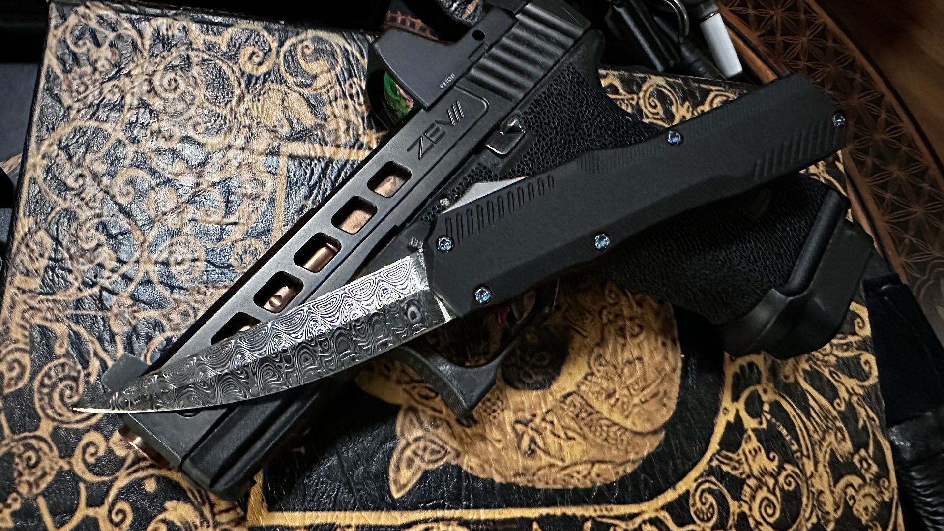 there was a mix of Dagger, Bayonet, Wharncliffe and two Japanese styled blades a modern KaIkea style and a classic Shobu style. He used different Damascus patterns and Takefu steel special anodized fasteners we included the bit and titanium pocket clips with a Damascus overlay.