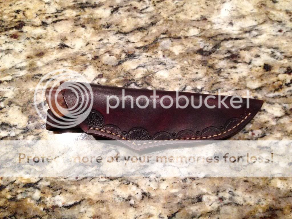 The sheath is hand stitched and hand tooled leather; fit specifically this knife.