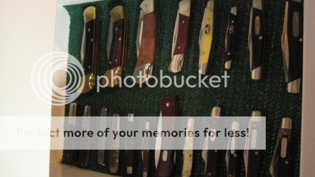 I don't display any knives, mostly because I only have users. I keep everything related to that in my man box, a 3 drawer Craftsman 26" tool box I got super cheap at a pawn shop. Top drawer is knives, razors, and the three watches that I have. Second is sharpening stones, water stones, and small tools for my knife making that are too valuable to keep in the barn/shop. Third is everything else. Portable ham radios, small metal aid box from WWII with mad money in it, spare batteries, stuff that I need that I can never find because no one in my family knows how to put things where they go (super glue, lighter, keys to the interior doors, etc.)