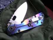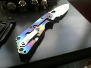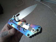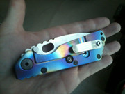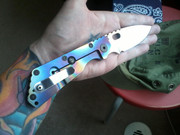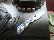 I decided to try flaming titanium again today on my tester knife, last time it didn't turn out so hot so i spent days sanding it off. I like how it turned out this time, i think i'll keep it for a couple days till i need to reuse the knife again for more practice. what do you guys think about the look of flamed scales in general? i'm on the fence with it, cause it looks pretty fruity sometimes, but some people who do it make it look amazing! any secret techniques out there you got to get patterns or something aside from just hanging the scale from a wire and using a torch on it?