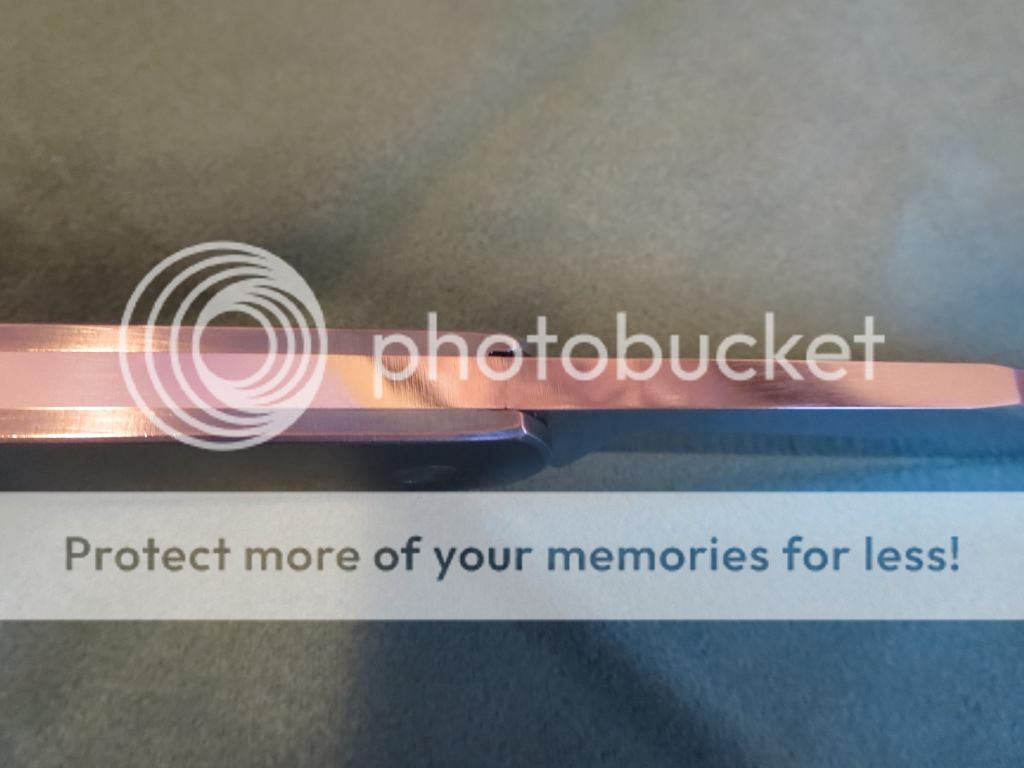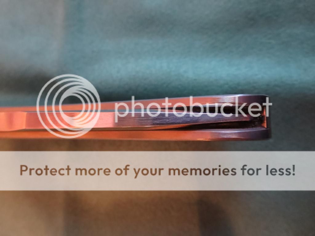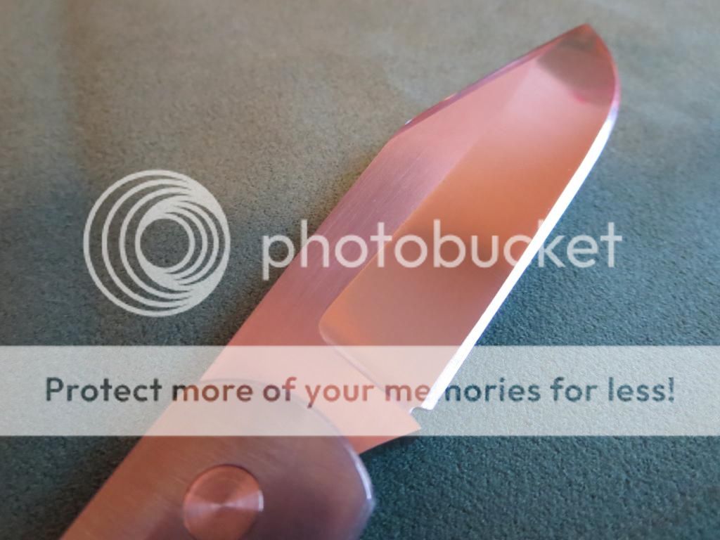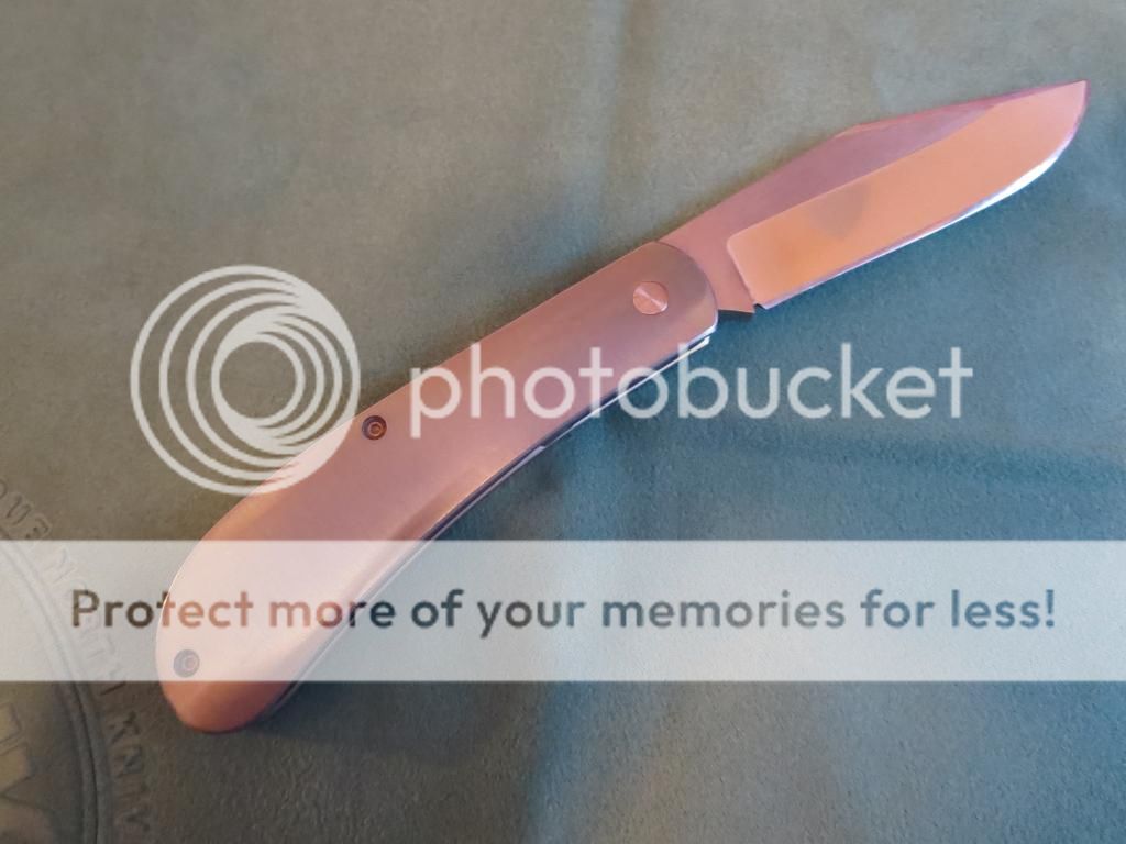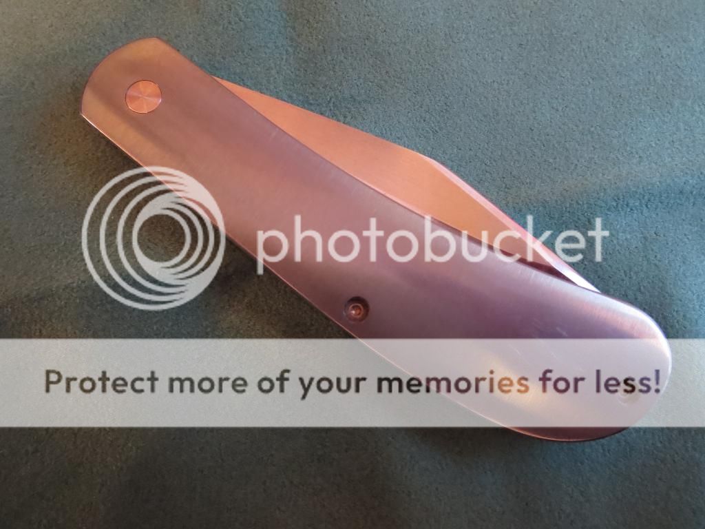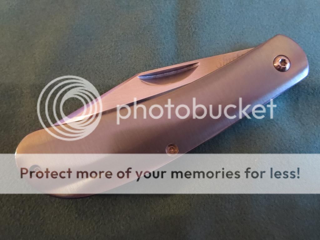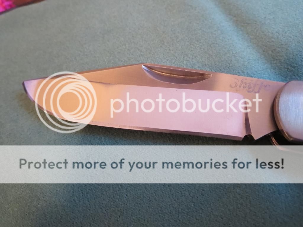 For sale is a slipjoint by Doc Shiffer. 4 1/2 inches closed, 3 1/2 inch blade. Titanium handles. I do not know the blade or backspring steel. I believe both are carbon steel and I know Doc made other slip joints with 52100 blades. Blade is centered, action is smooth and firm. This has a half stop. There a few light marks on the handles and backspring. Blade has very light spotting toward the front of the blade and is pictured below.