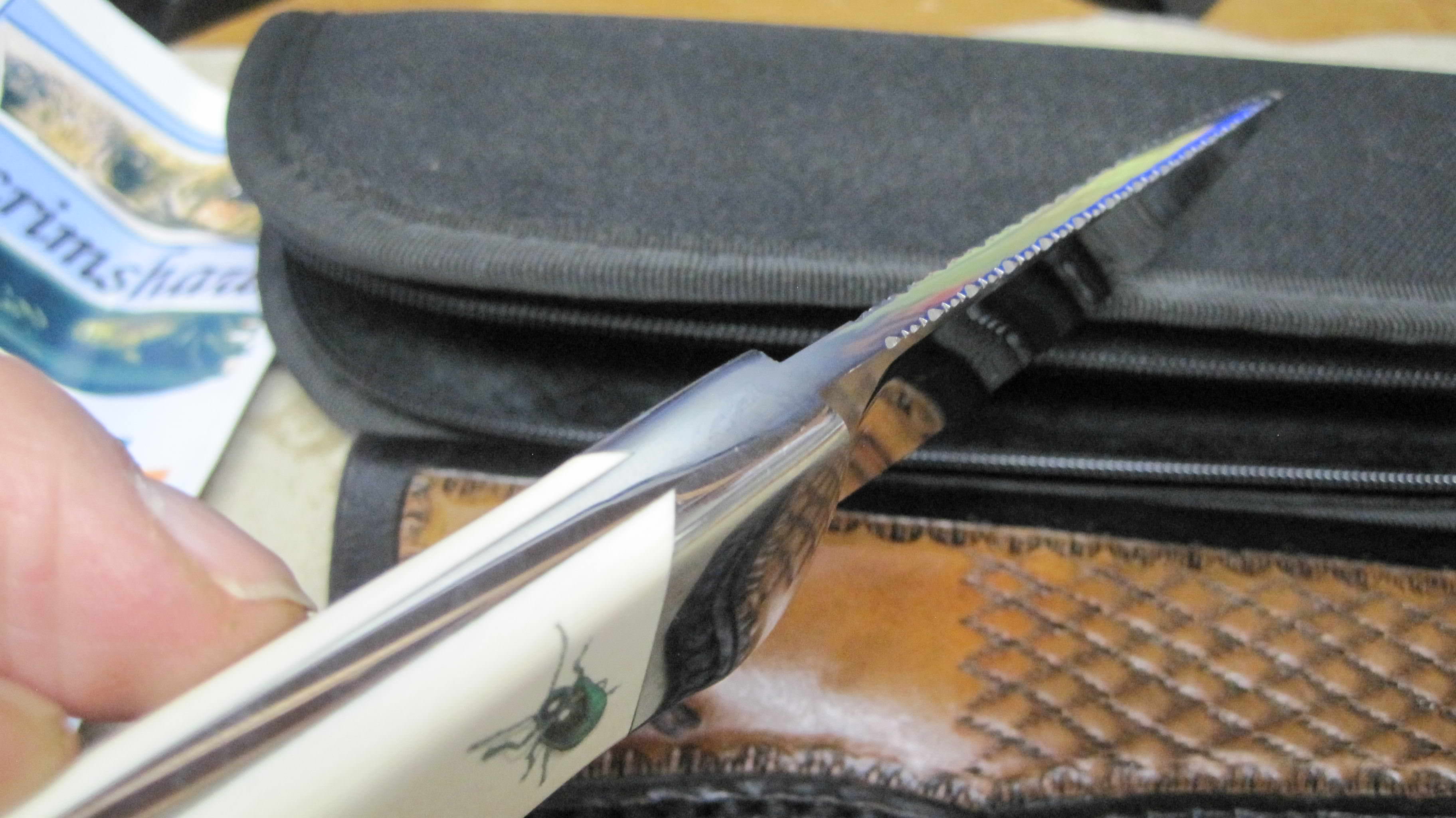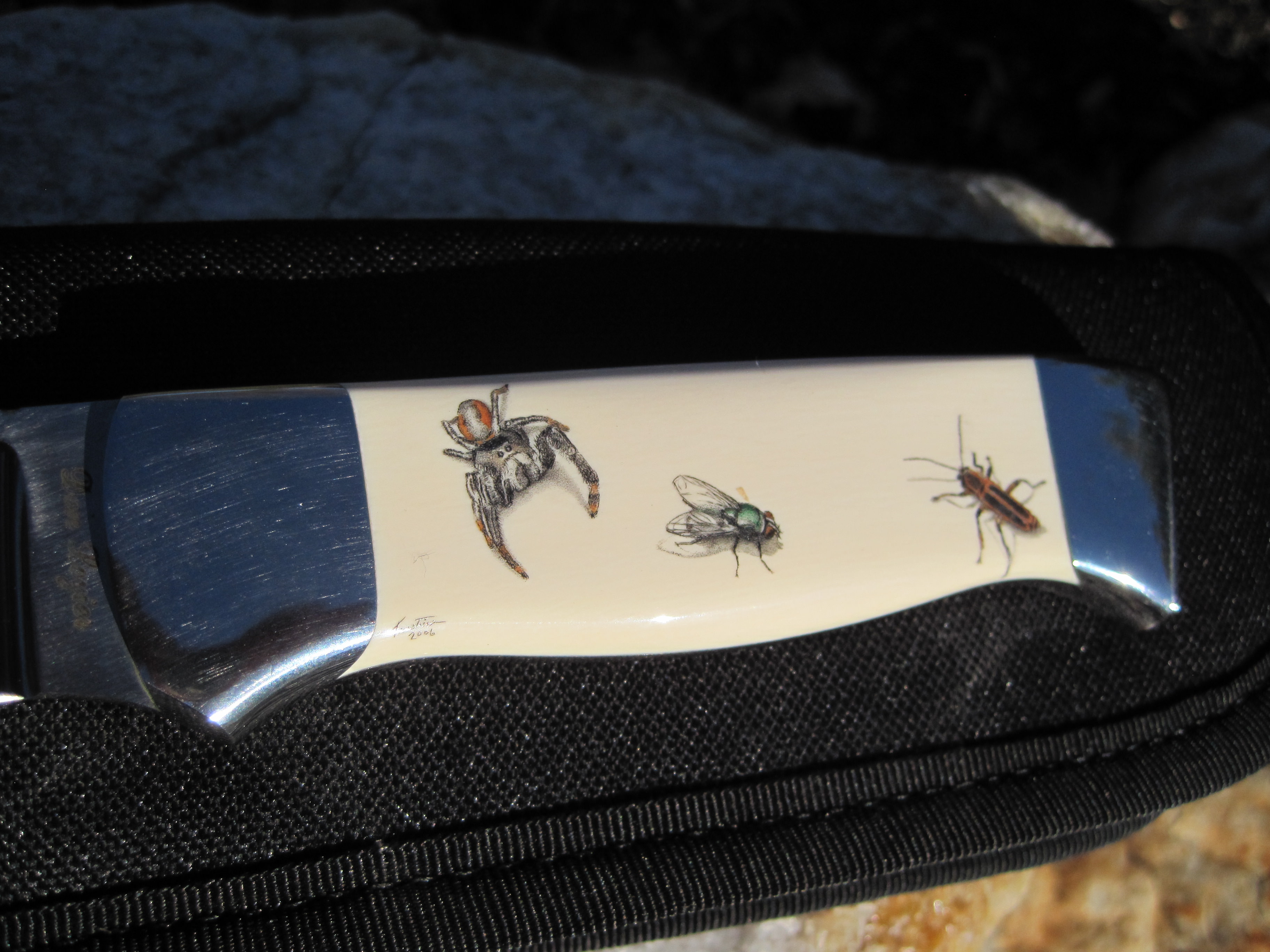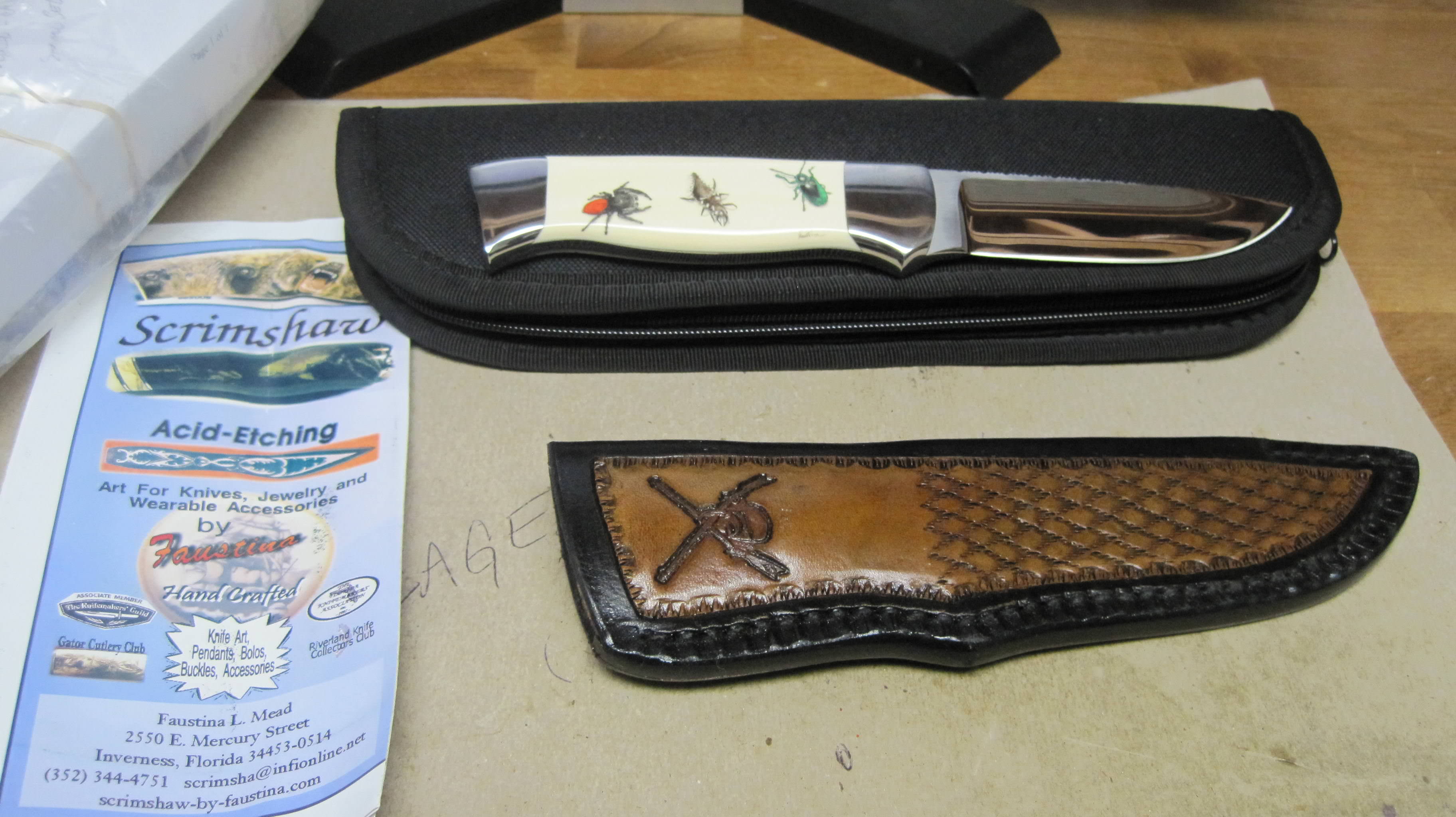 This mint condition Don Lozier Drop Point Hunter model is made by an award winning knife maker, voting member of Knifemakers' Guild since 1991. This knife has a mirror polish, 1" width, hollow ground, fileworked blade spine of 3/16 inch thickness ATS34 steel blade. It has 416 Stainless Steel dovetailed Bolsters and ButtCap, 4" Blade, 8.75" Overall length, 7.7 oz weight, Full Tang, Drop Point Hunting knife, ELEPHANT IVORY handle with Scrimshaw by Faustina Mead, Custom Sheath by Fred Eisen, Rc 59. All in a nylon zipper pouch. Has been stored in my gun vault since purchase, never carried or sharpened.