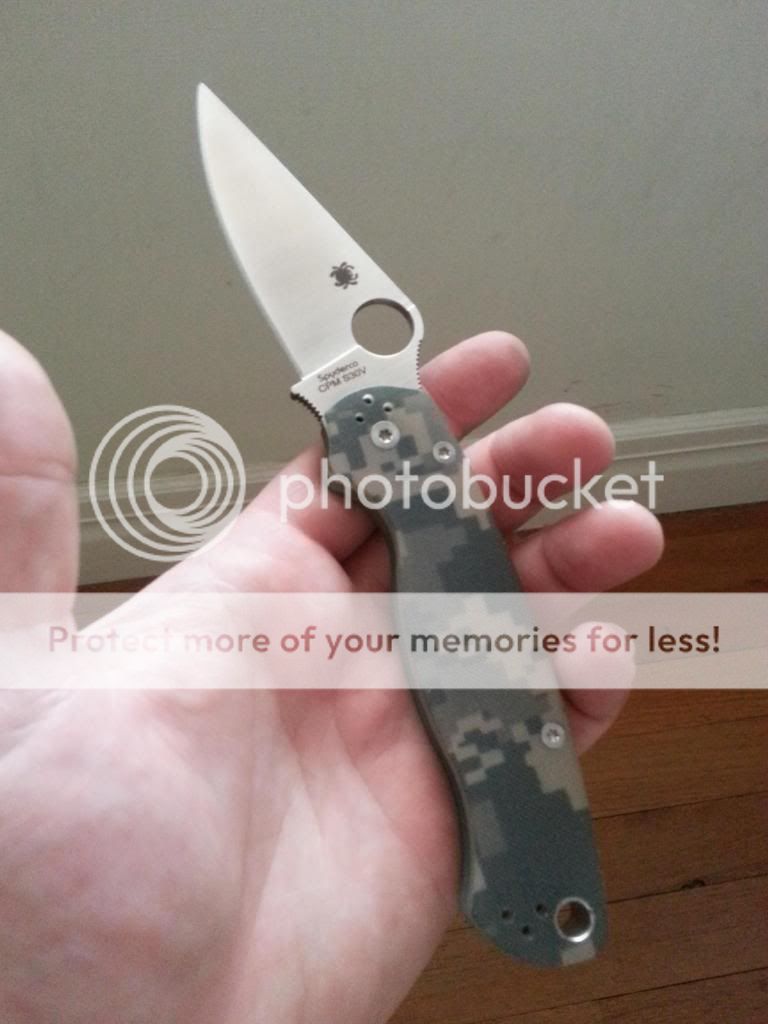 Spyderco Paramilitary 2 digicam with satin blade (no box included). This knife was dropped and has a small chip off the tip of the blade. Its not too bad and could be fixed very easily. The blade is otherwise is excellent condition and still razor sharp from factory. Except for the small chip it is in excellent condition. For those of you who are good at sharpening and reprofiling this would be a great chance to get a pm 2 for cheap. You could probably send it back to Spyderco as well.