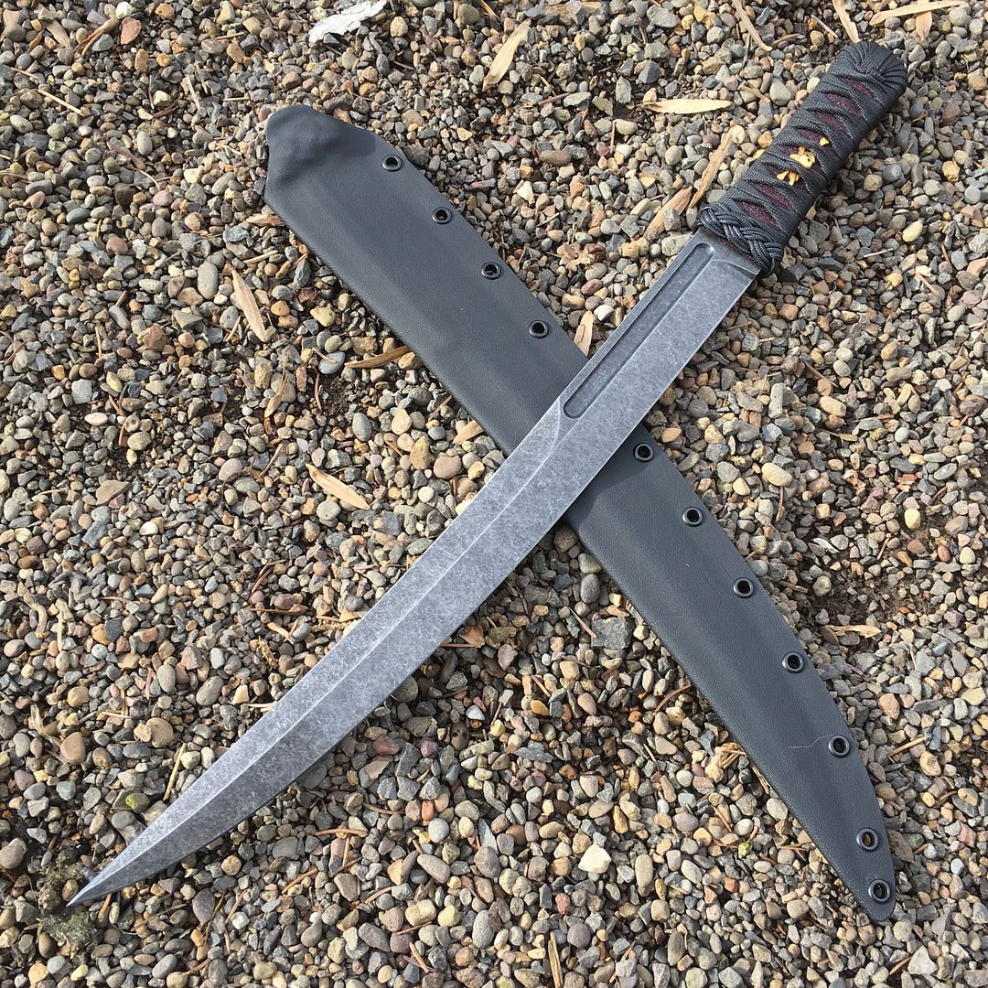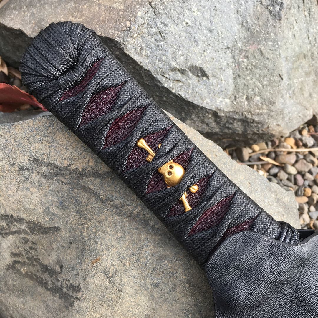 It has a 16" CPM 3V blade with my custom Heat treat and Cryo and some awesome 24k gold menuki from Fred Lohman. The handle has a dark burgundy underwrap which contrasts nicely with the menuki.