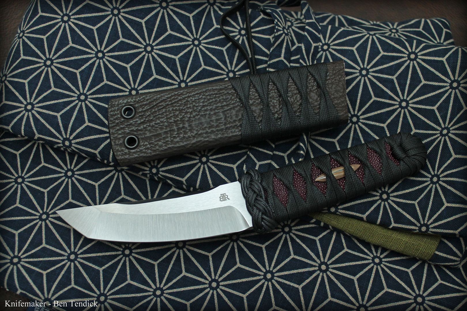 The sheath is Aluminum, wrapped in gorgeous chocolate Skark skin and lined with kevlar. The "sageo" adds grip when tucked in your belt, and also extends to act as a static cord.