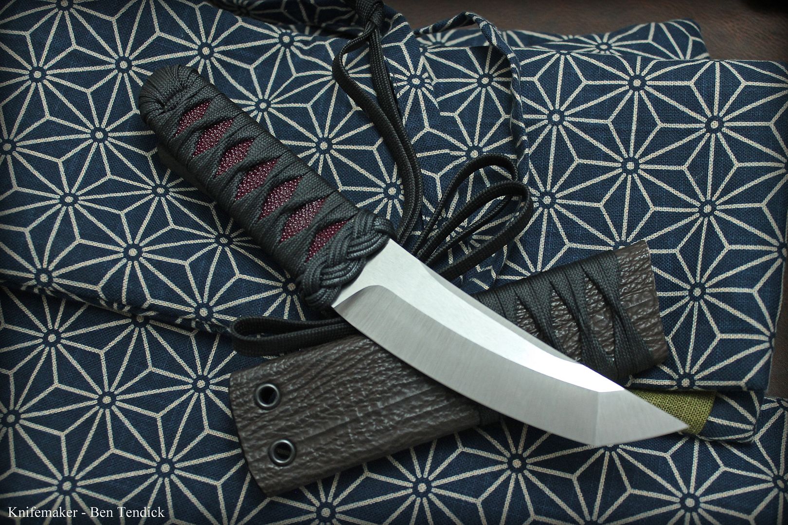 Handle - Tsuka Ito, with burgandy stingray. The menuki is fossil mammoth Ivory bark. The whole handle is Epoxy soaked with marine grade G/flex epoxy for durability.
