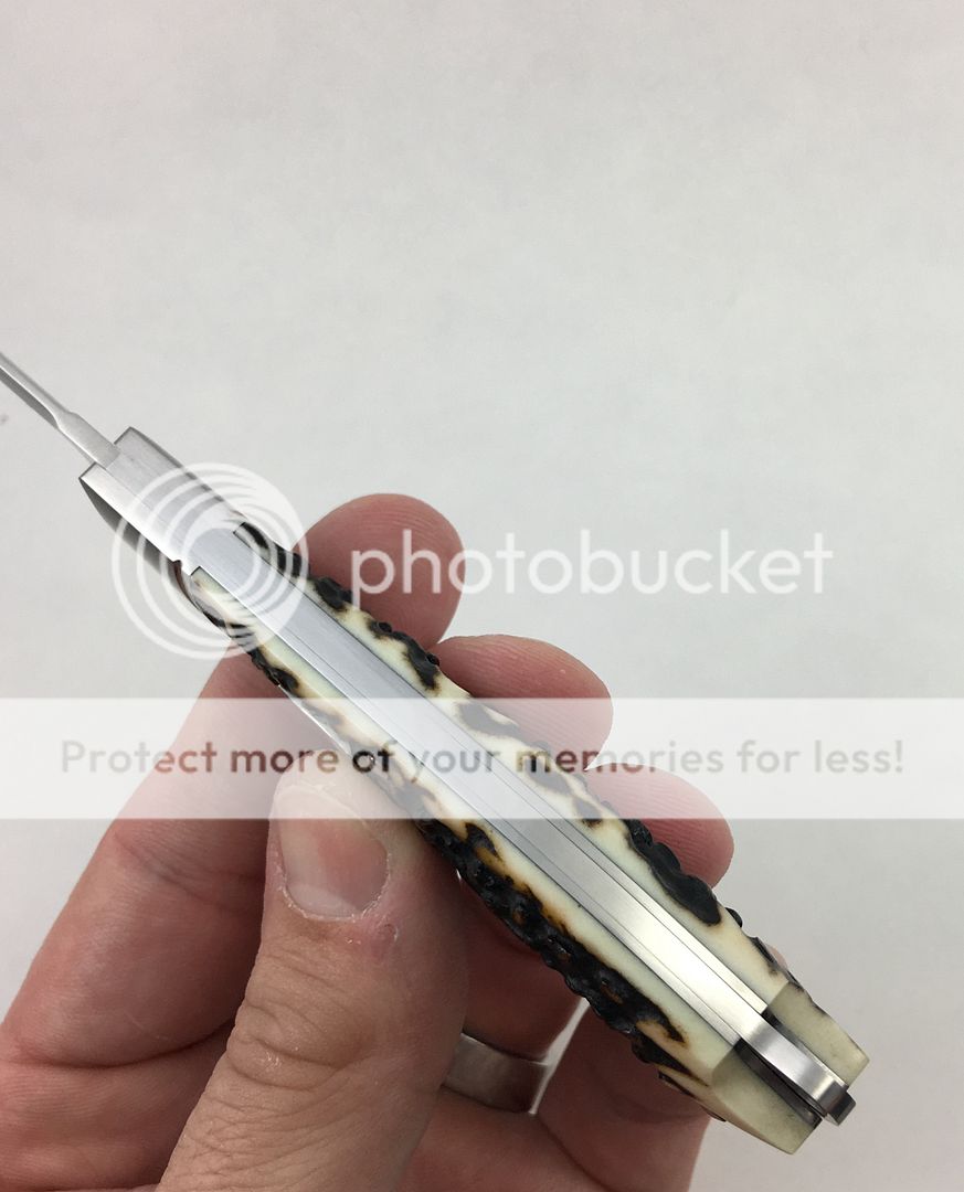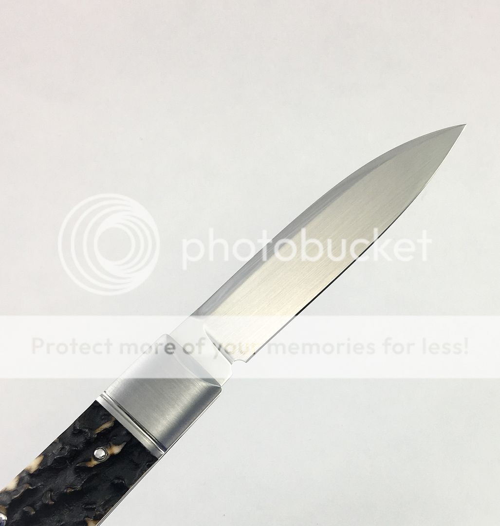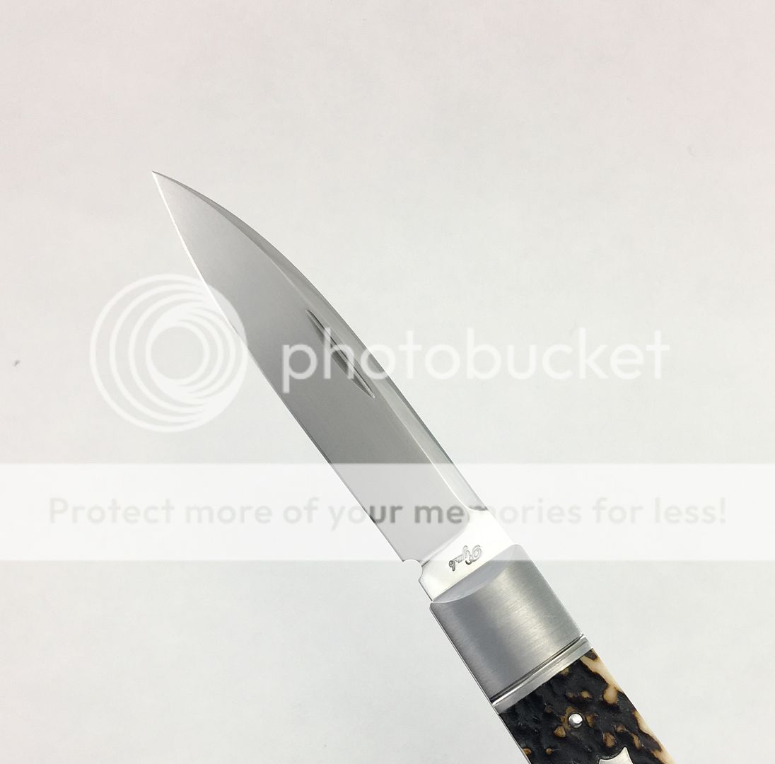 Next is a Ryuichi Kawamura Gunstock Jack w/Gunhammer Lockback. I purchased this knife new from a dealer this past year. Absolutely beautiful knife. I have carried it maybe twice in a pouch, it is a safe queen. Silky smooth action, solid lock up, no blade play, and gorgeous stag. Blade favors the left ever so slightly. There is one small mark on spine I was unable to photograph, but in the right light it is there. There are no other marks on the knife that I was able to see or photograph, but since I have carried it, I will assume there is one or two somewhere as that always seems to be the case. This is truly a beautiful piece. Asking price for this one is $1050. DM me with any questions, thanks for looking!