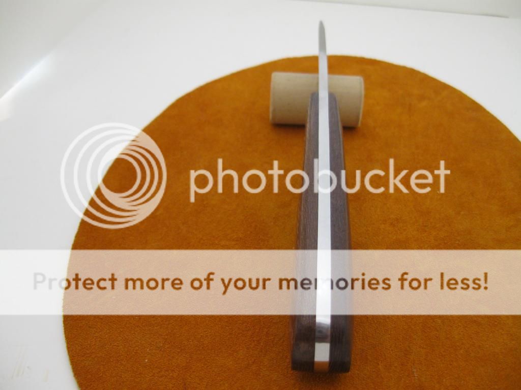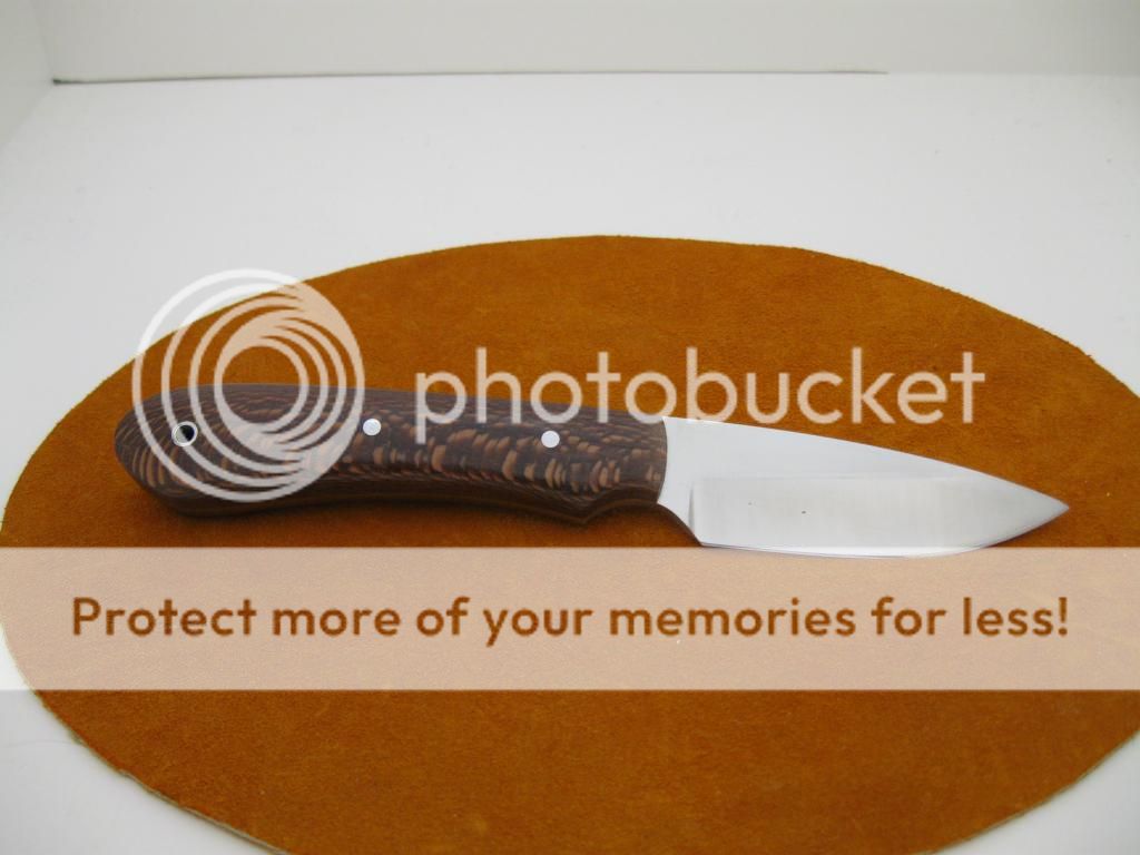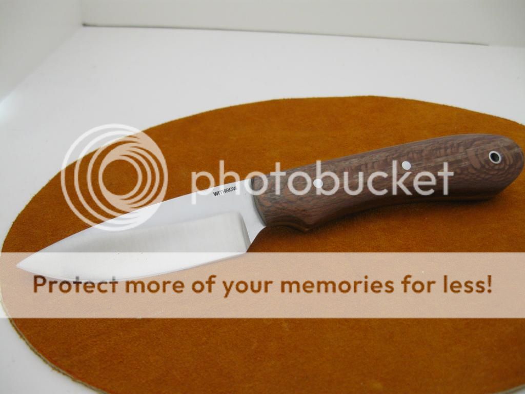 Steel is ATS34, cryo heat treating by Peters'. Stabilized Sycamore handle.