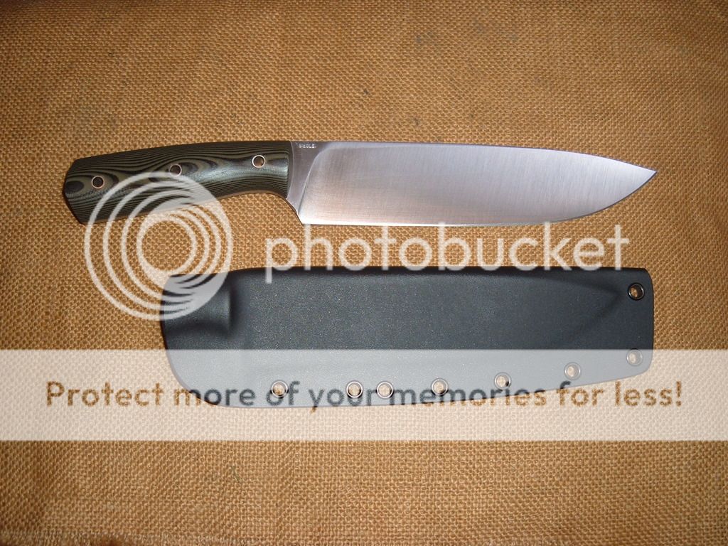 The scales are black/OD G10 with stainless steel tube fasteners. 12 3/4in overall with an 8in blade tip to handle. The blade is 1 13/16in wide. Comes with a black Kydex sheath with a Tek Lok. Price is $350 shipped in the US.