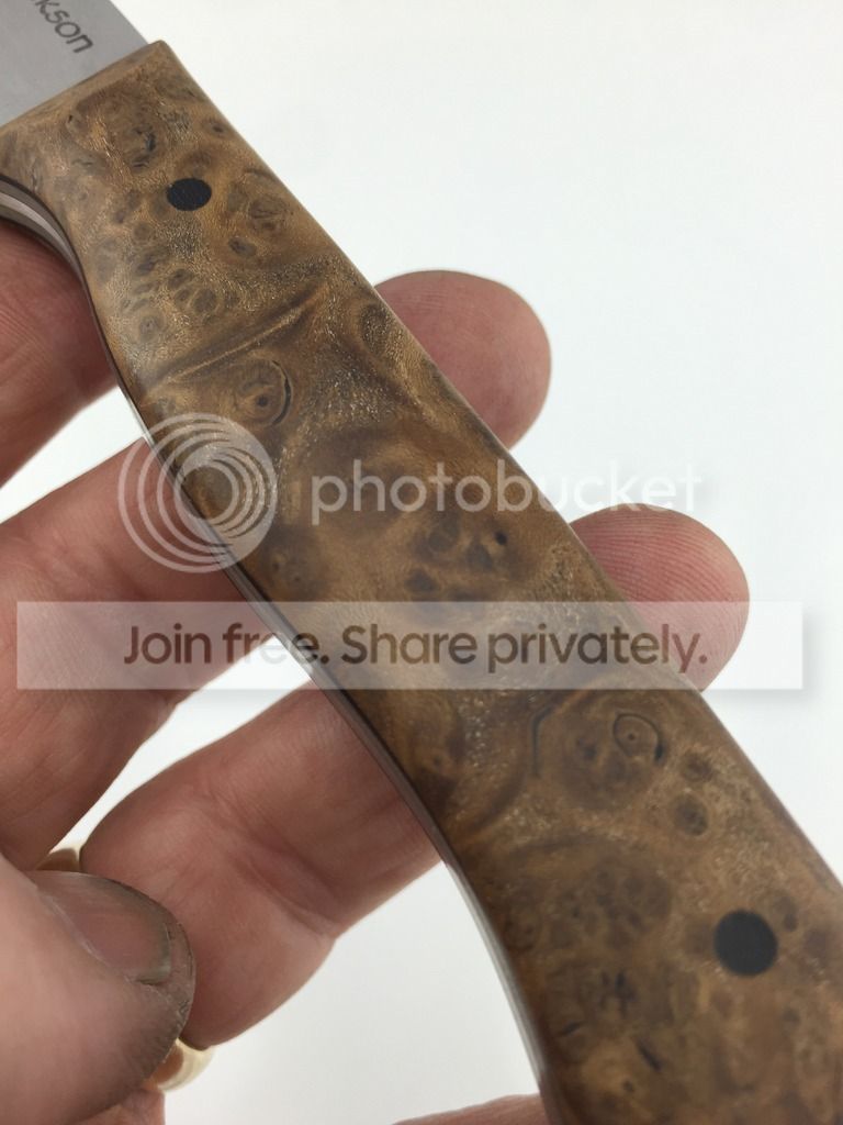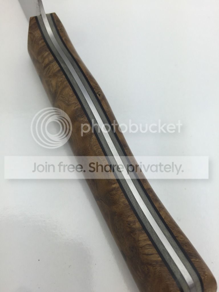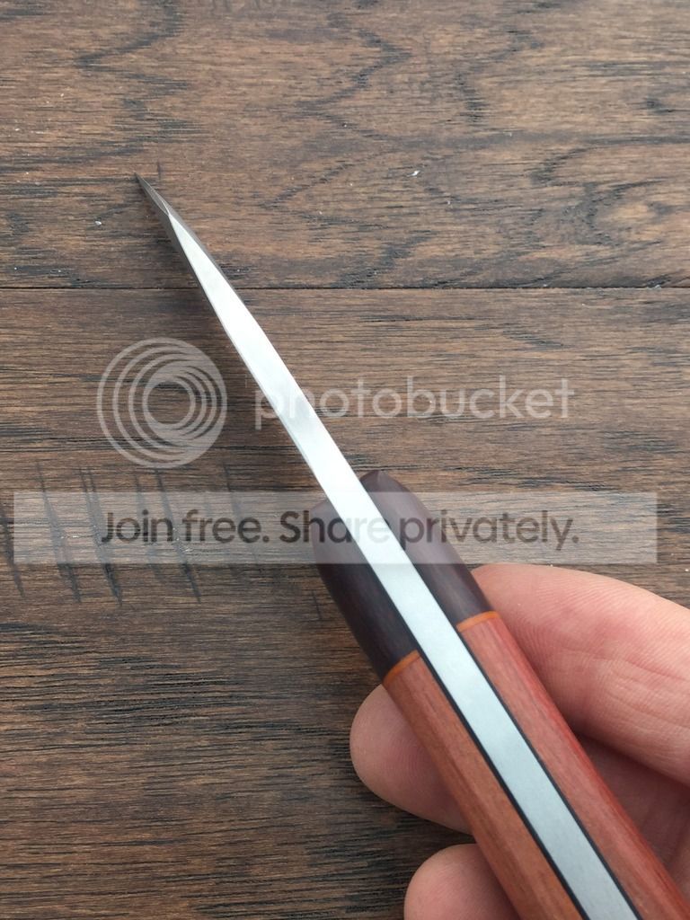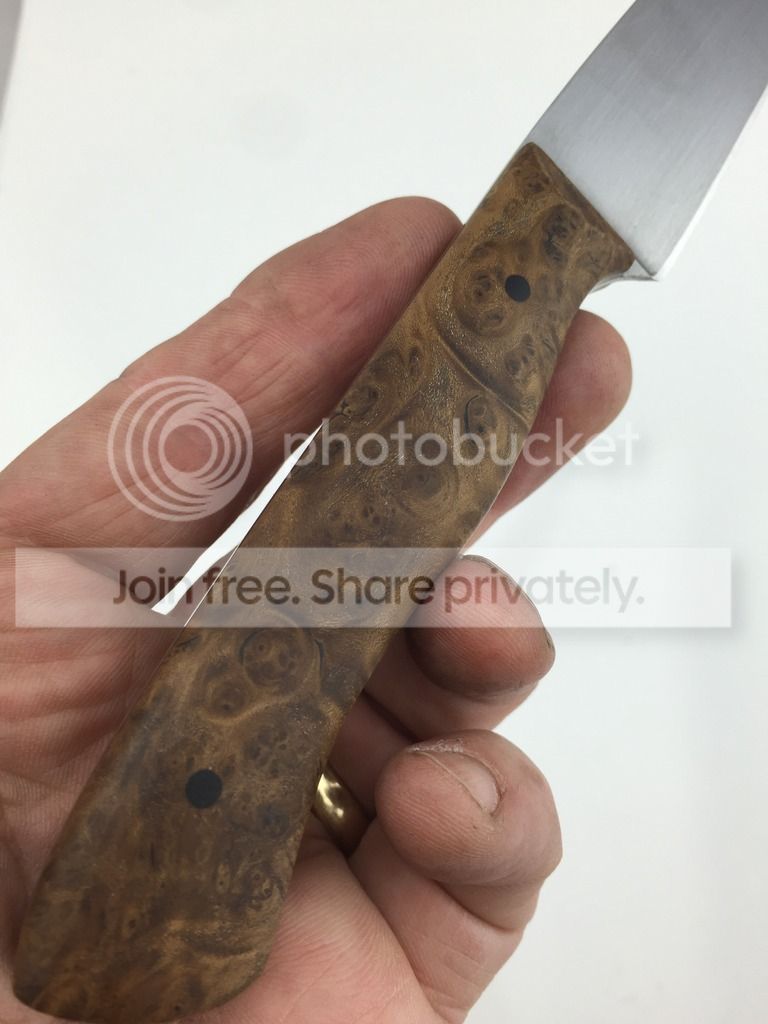 Blade: 4.5" long, 1" wide, high flat grind with rounded spine and distal taper. It has moderate flex. It is hand sanded to 600 grit and is 0.005" behind the edge. Sharpened to 17DPS