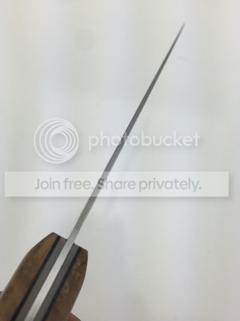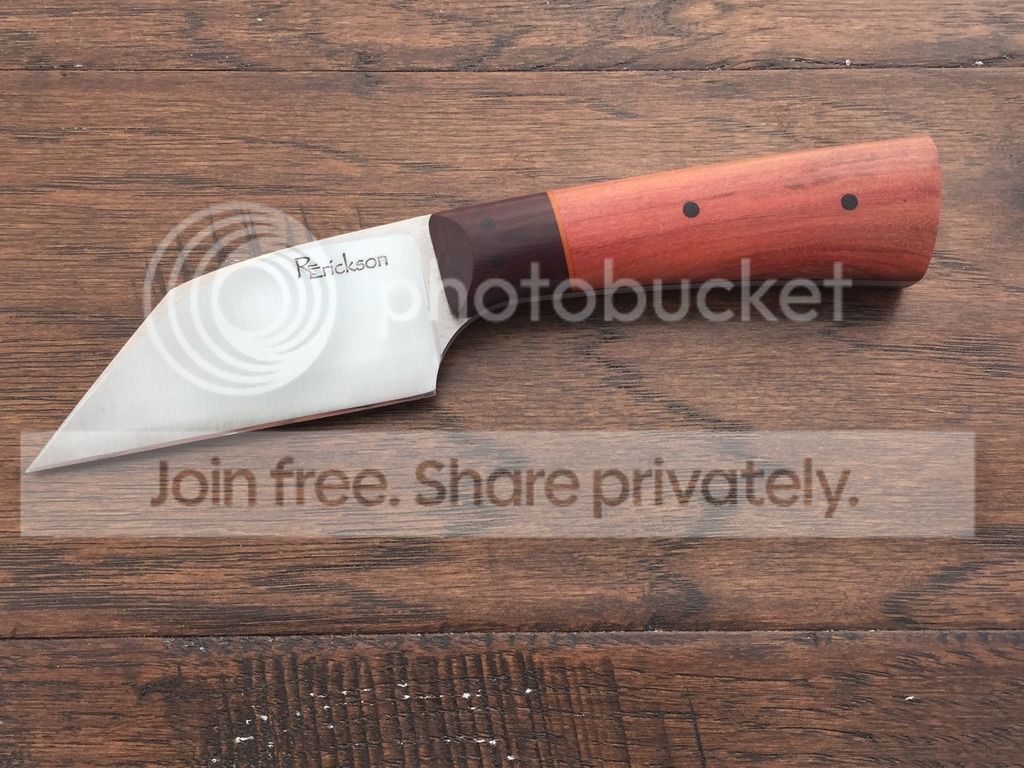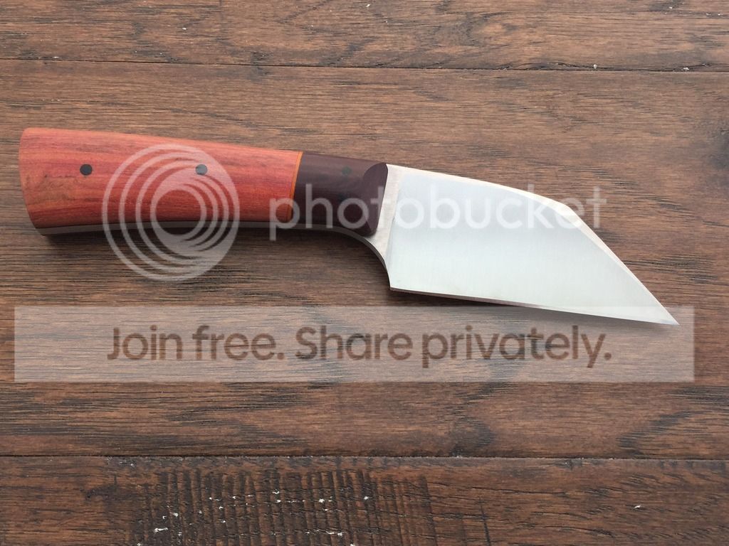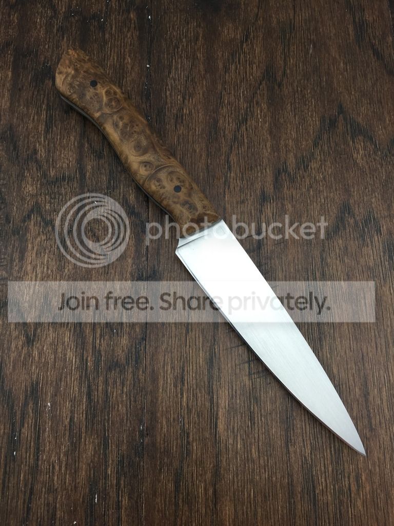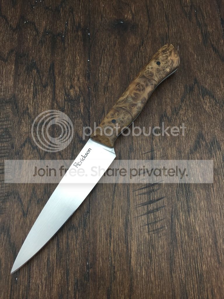 Blade: 4.5" long, 1" wide, high flat grind with rounded spine and distal taper. It has moderate flex. It is hand sanded to 600 grit and is 0.005" behind the edge. Sharpened to 17DPS