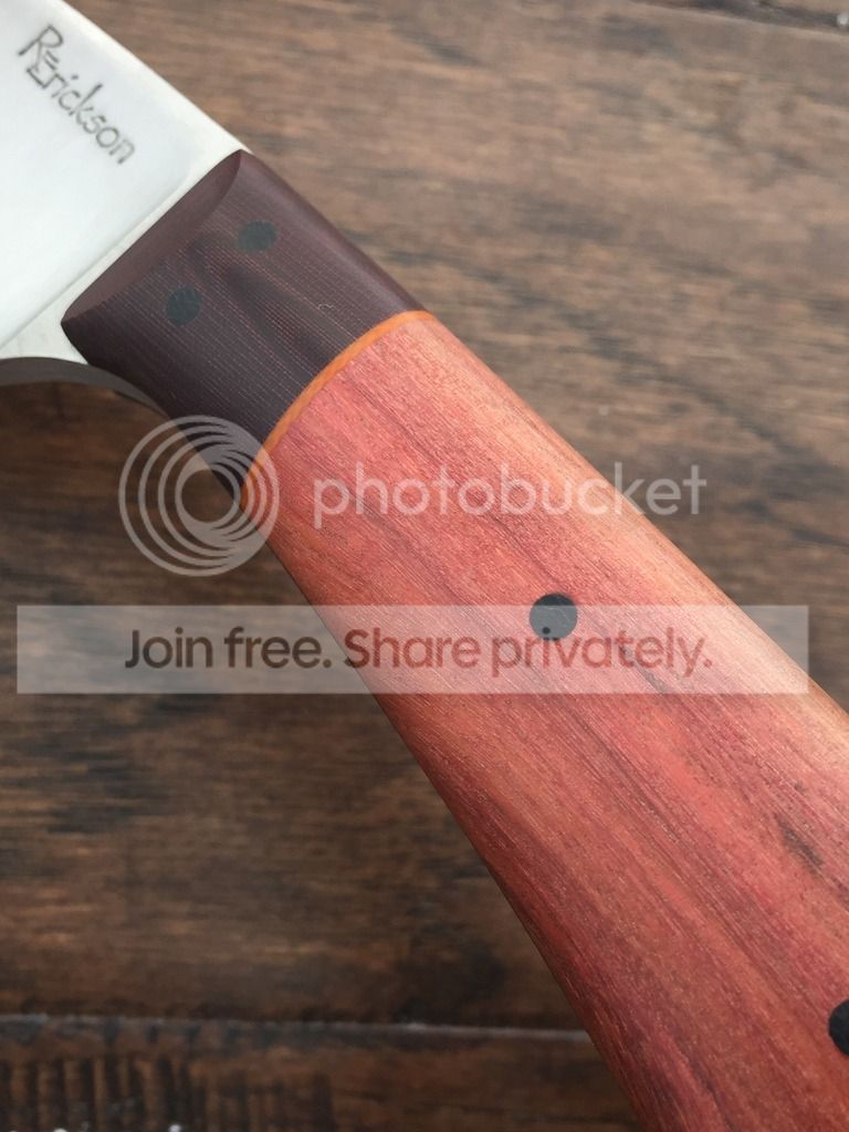 The first one is a re-post of a hunter I did last month. It's AEB-L steel and African Blackwood handles. It's full flat ground and sharpened to 17 DPS. The blade is 0.13" AEB-L heat treated to RC61 by Peter's. The liners are black and white G10. It has bronze pins and a carbon fiber lanyard tube. A leather sheath is included.