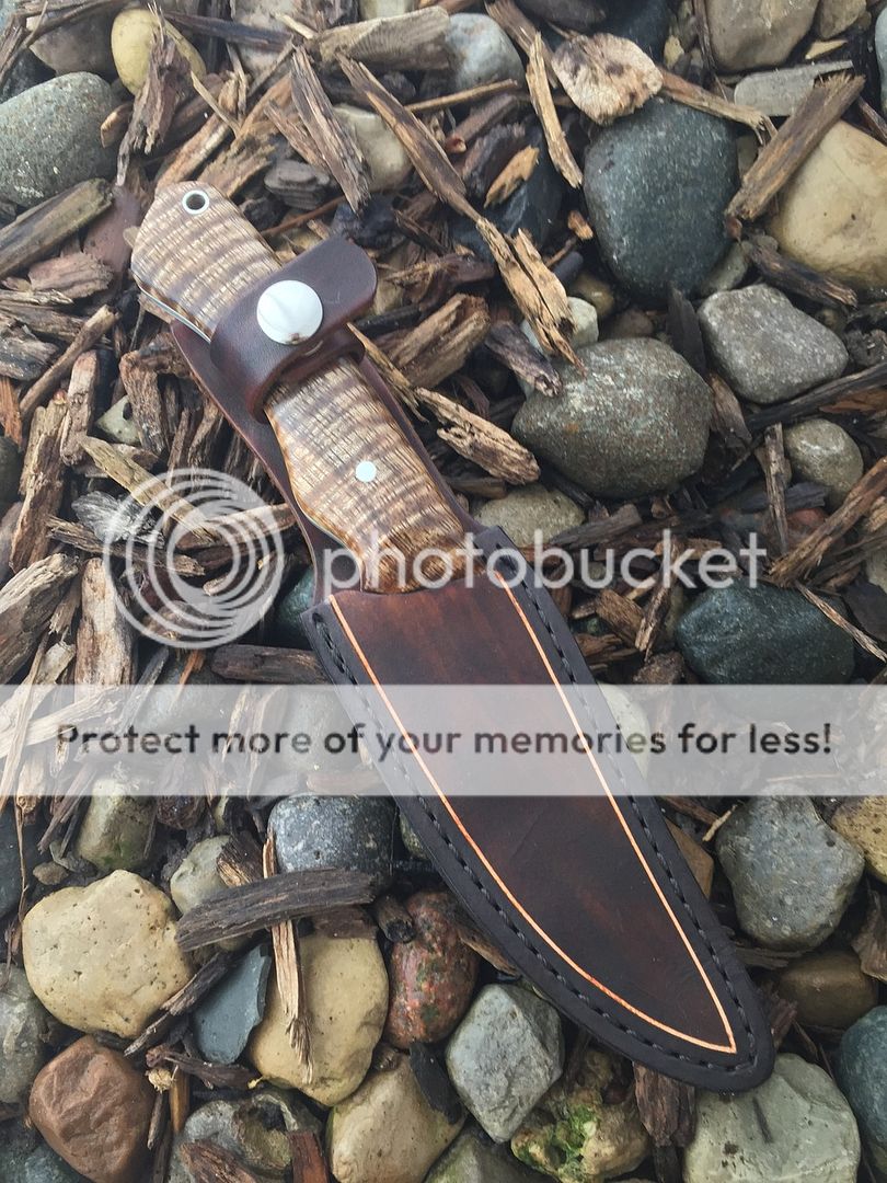 I'm re posting a nice little hunting knife I made with Aldo's 5/32" 1084 steel and stabilized Hawaiian Silky Oak I got from Burl Source. The photos do not do this wood justice. It has great three dimensional curly figure! It feels great in the hand and is super sharp. Proverbs 27:17 is one of my favorite verses and is etched on the reverse side of the blade: "As iron sharpens iron so one man sharpens another"