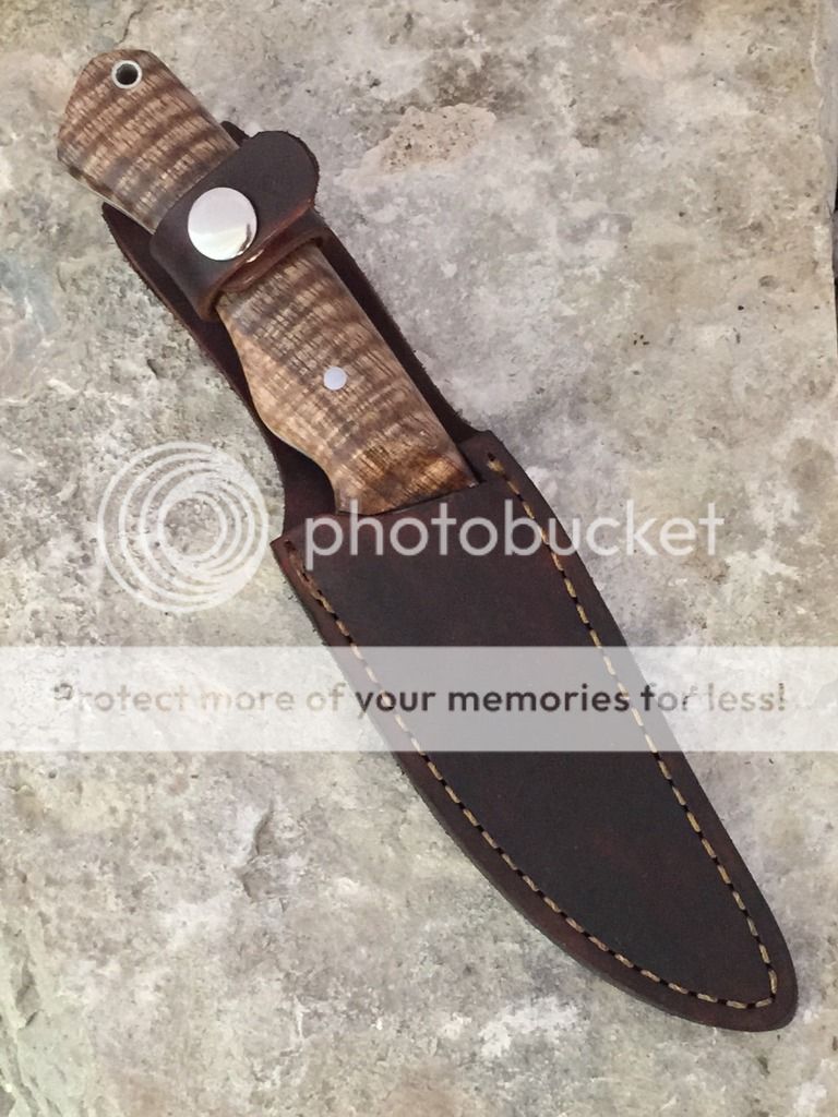 Today I'm offering a nice little hunting knife I made with Aldo's 5/32" 1084 steel and stabilized Hawaiian Silky Oak I got from Burl Source. It feels great in the hand and is super sharp. Proverbs 27:17 is one of my favorite verses: "As iron sharpens iron so one man sharpens another"