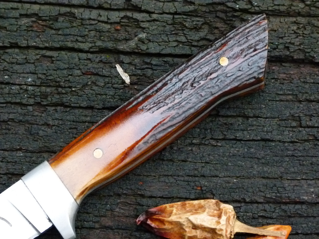 This encasing is red deer antler, the guard is 420 stainless steel.