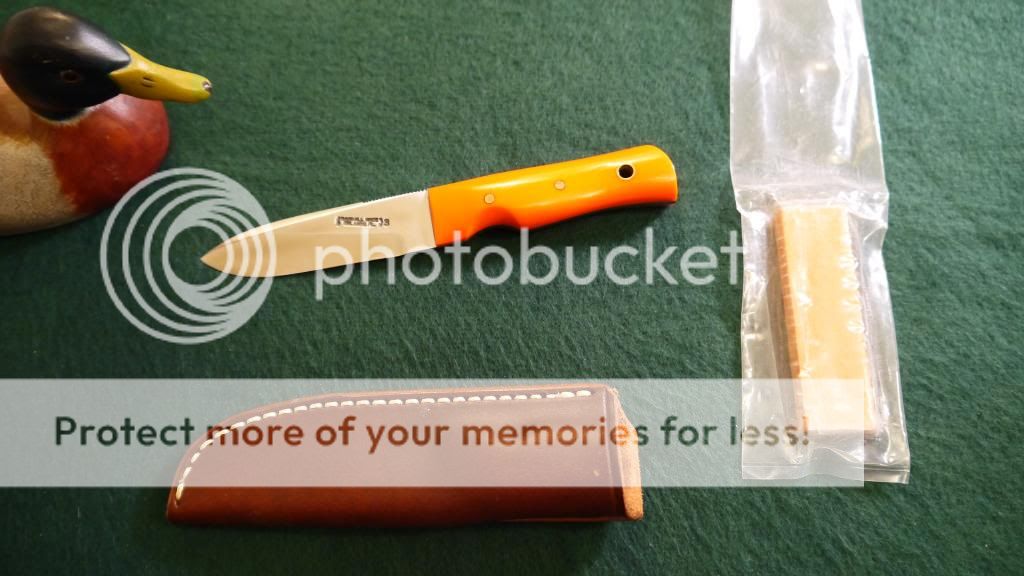 Randall's small saltwater utility. This one is cool, with orange g-10 scales. Stainless blade. Thumb notches. No stone pocket on this sheath, but there is a stone.