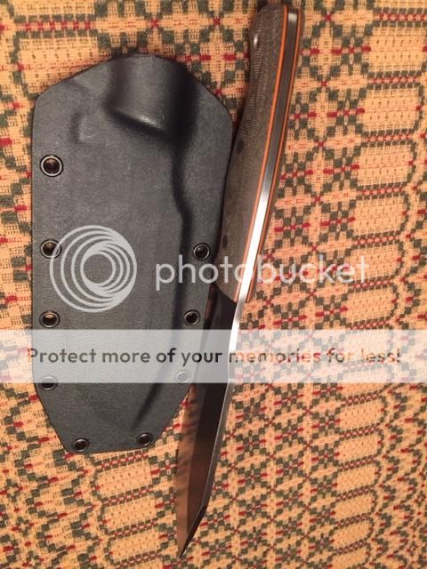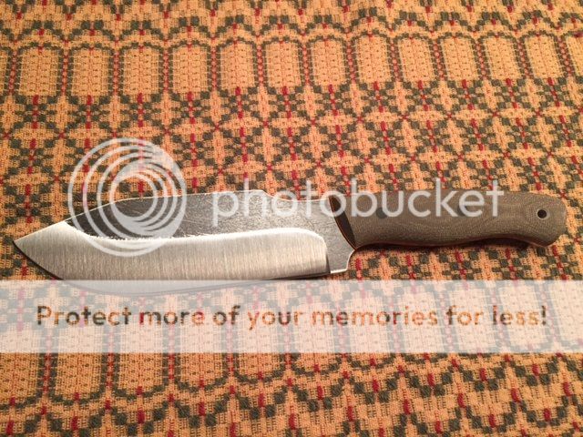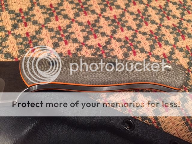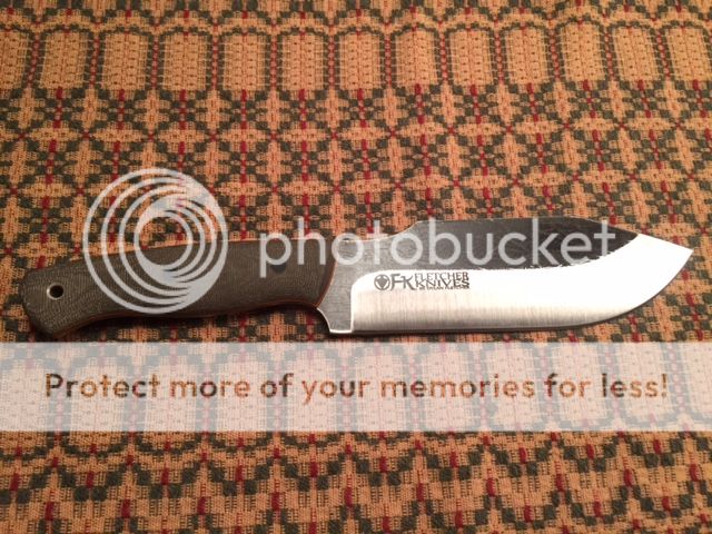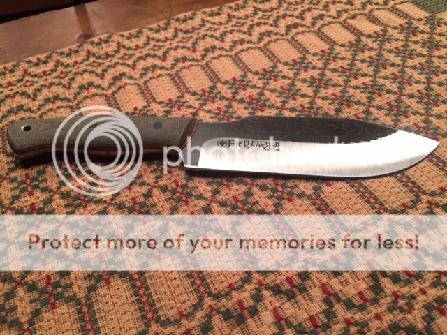 Fletcher Knives Hatchula II Green micarta over black G10 with orange G10 pinstripes. O1 steel with a convex grind and ~12" OAL. This knife would make an incredible chopper and bites really deep, it's also very comfortable in the hand. Other than chopping it once into a piece of wood, the knife is unused and comes with kydex sheath. There are a few marks from the kydex sheath on the blade which is to be expected. Really sweet blade.