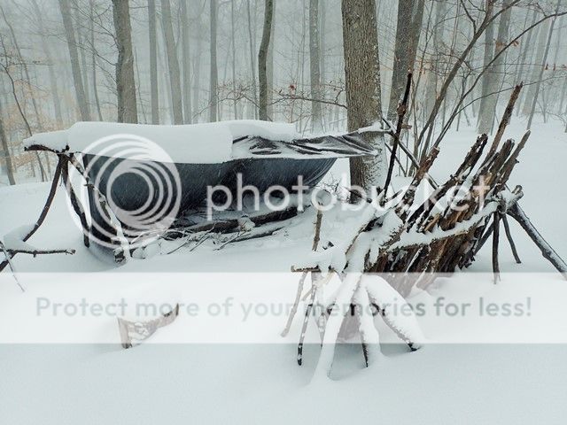 It was slow travel down to the river and even slower back up. I began to question my choice to leave the fire in this blizzard, but I felt there was enough wood for me to leave it unattended. When I returned, I saw smoke trailing around my tarp and the fire was still going, but had gone down to coals mostly, which was perfect.
