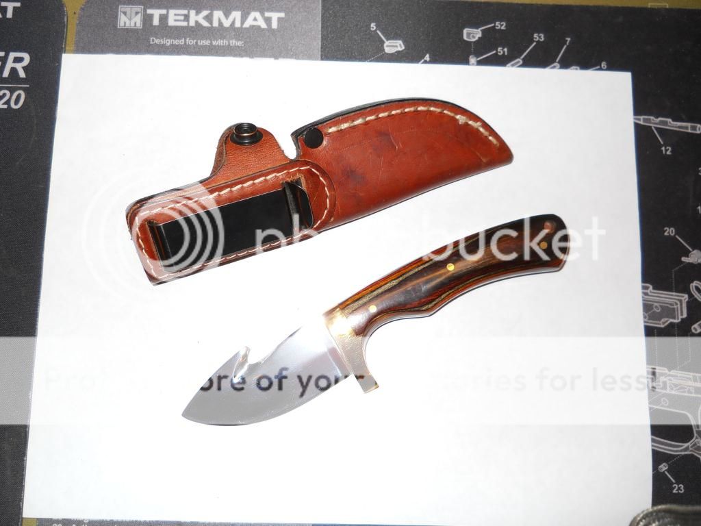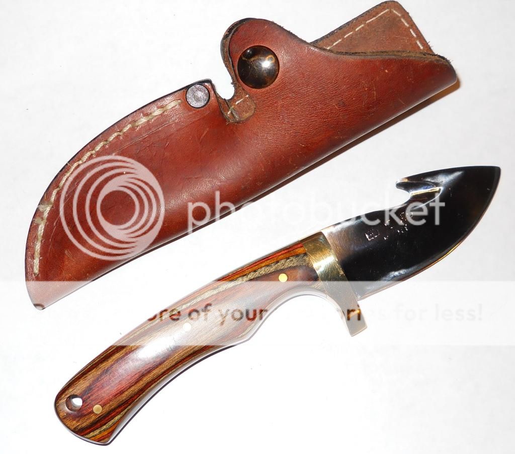 Ed Jones custom skinner, polished full tang ATS-34 blade with gut hook and Dymondwood laminate scales. Unlike some gut hooks this one actually works very well. Includes handmade leather sheath with belt clip.