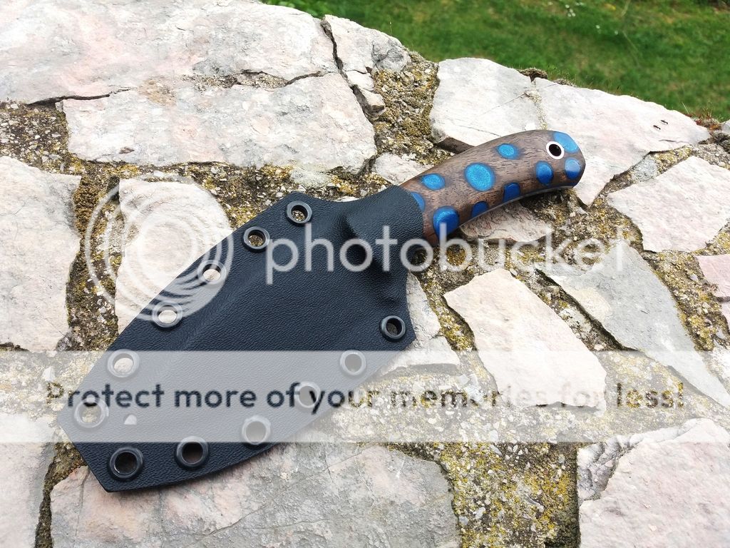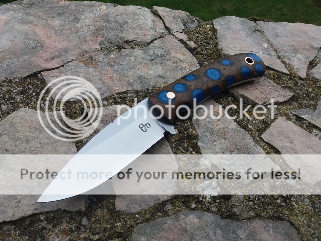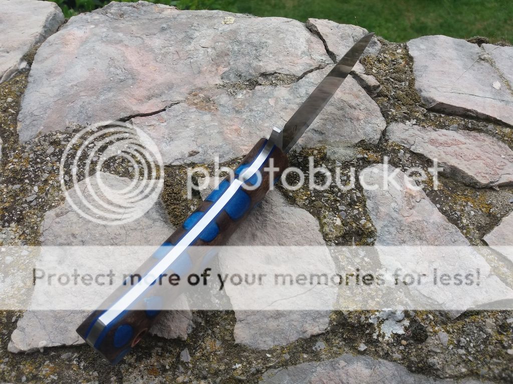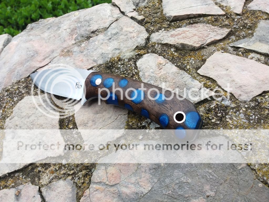 Handle: Stabilized walnut burl with blue resin with blue fiber liners