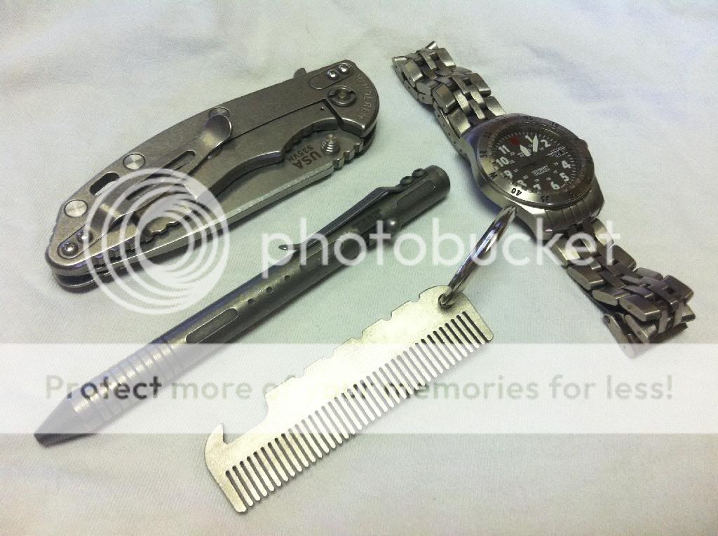 Looks like a cigar cutter to me although I am not familiar with it. The watch looks to be a Citizen Titanium Sailhawk which is a neat watch.