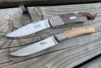 165 (~6.5") mm straight blade on the left, 144 mm (~5.5") recurve on the right. I'll PM you where to buy at least the left one, if you like ...
