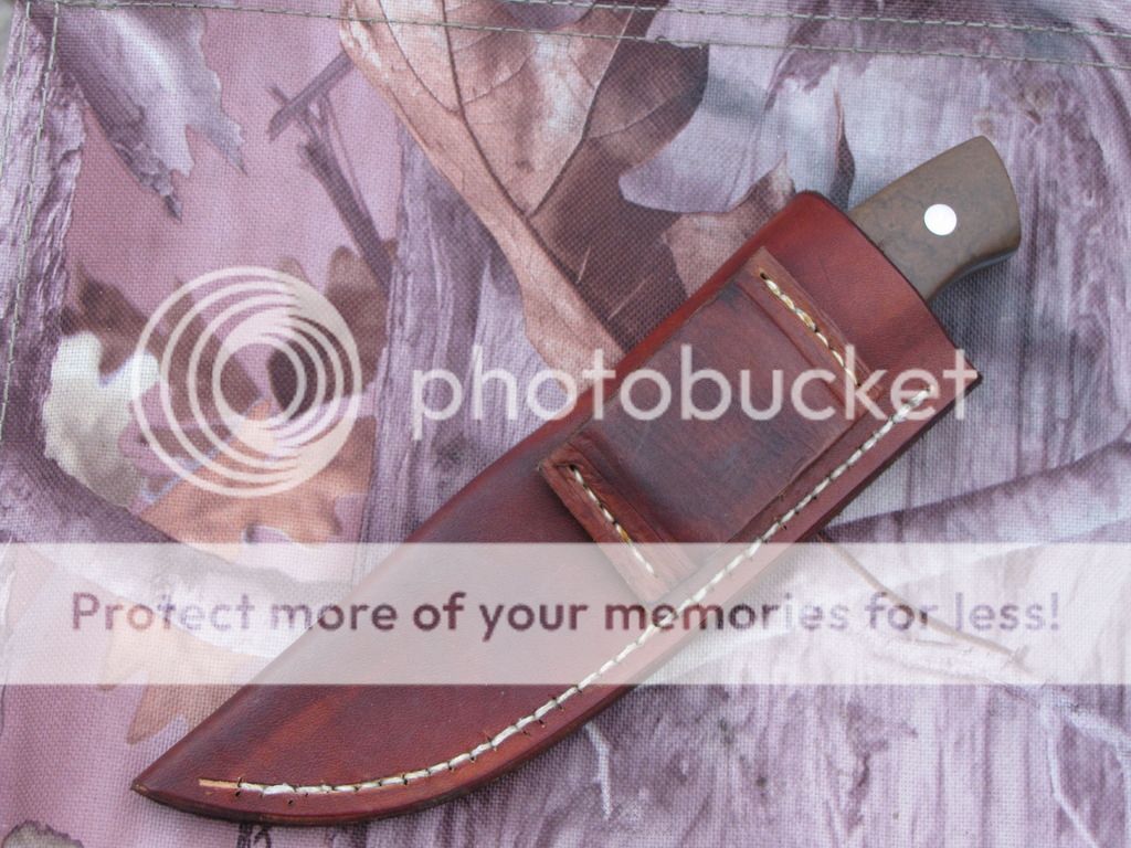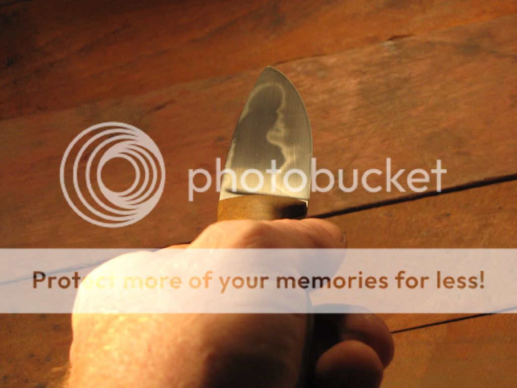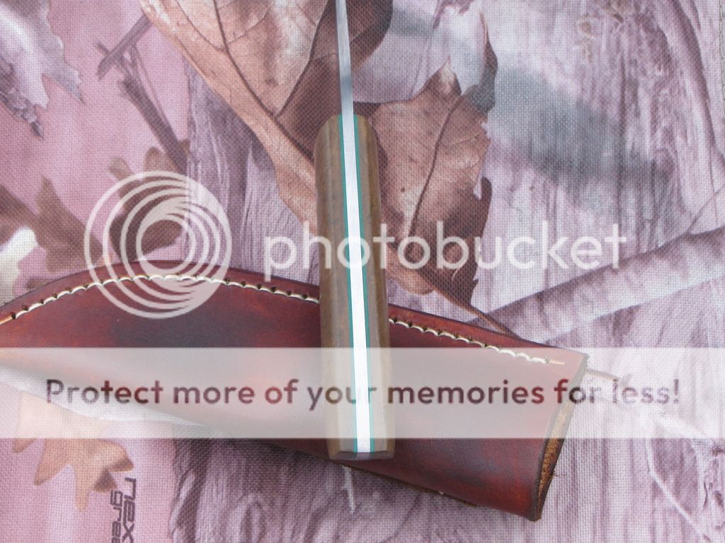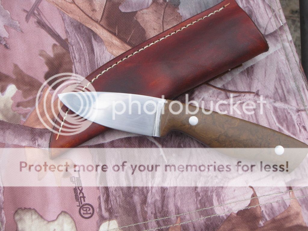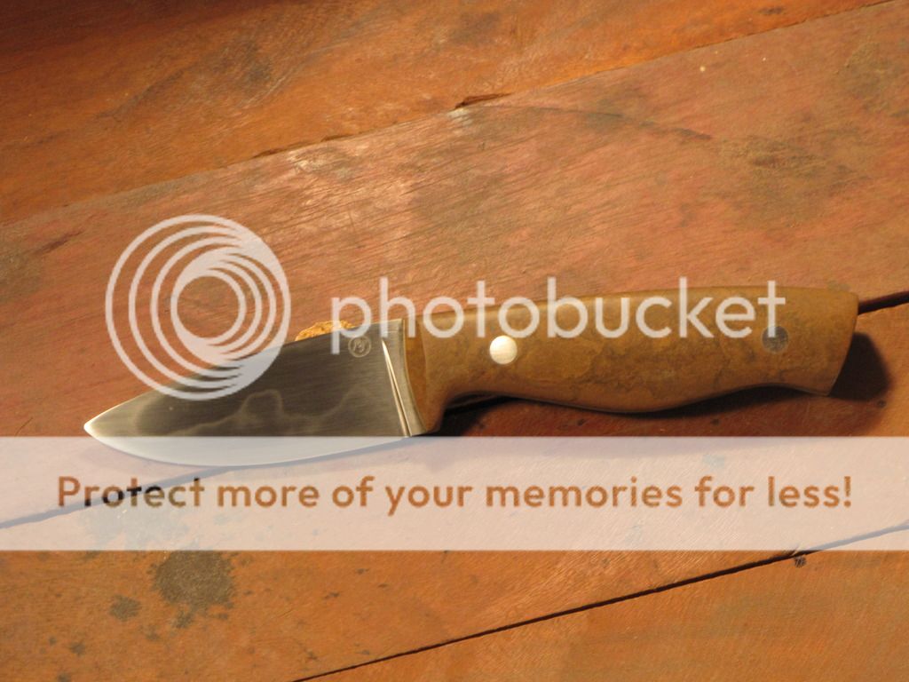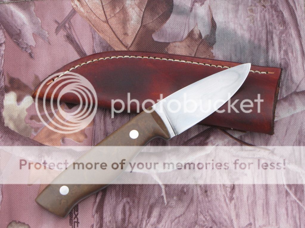 Here's an EDC from 1/8" 1095. Blade is 3" with a Hamon. Handle is 4 1/8" with Wood in a Can. It has green vulcanized paper liners and a stainless Corby bolt. It is heat treated in an Even Heat kiln and quenched in Parks 50. Flat ground with a convex edge. Heat treated to 58-59 RC.