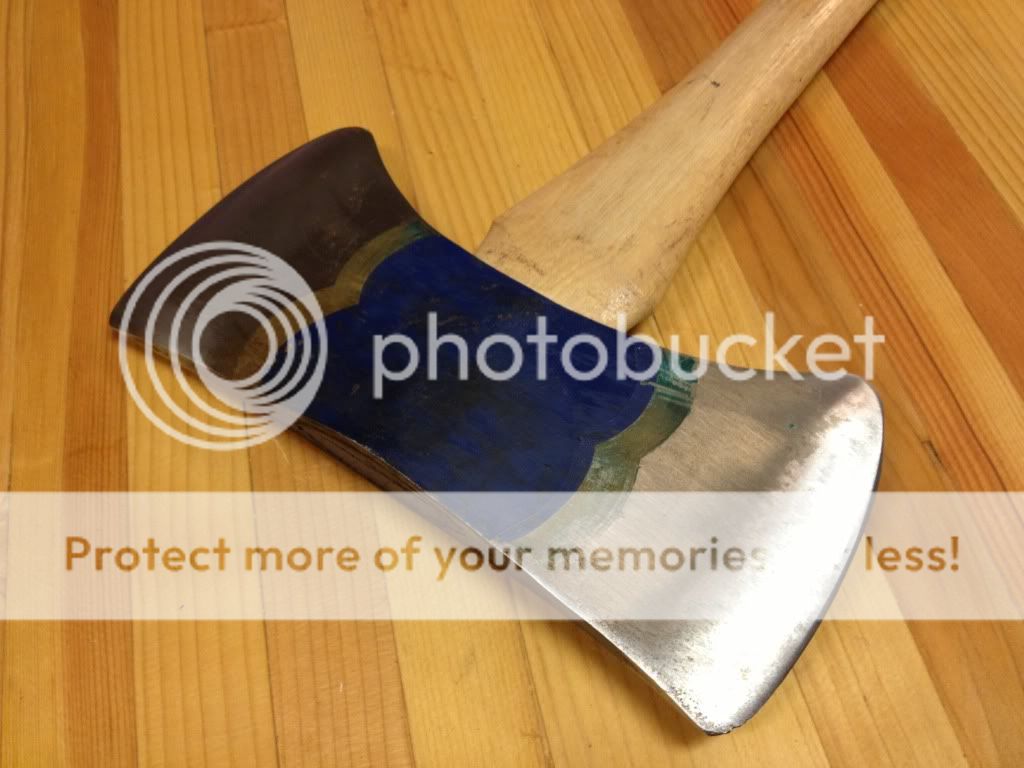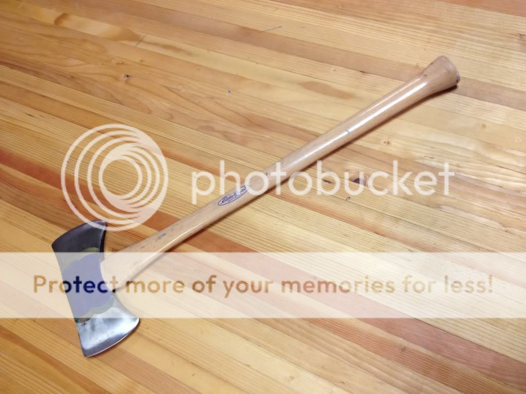 Just got this guy in the mail. It came with the original sheath too, but I didn't snap a pic of that. Not sure who the maker is but the weight stamp in the last photo looks similar to those Kelly used on their axes. Not definitive though. Hoping to find some old EB catalogs now to get a date on it (40s? 50s?) and see how it had been marketed. It's not hung terribly well. I'll probably give it a coat of WD-40 and put it aside as a non-user.