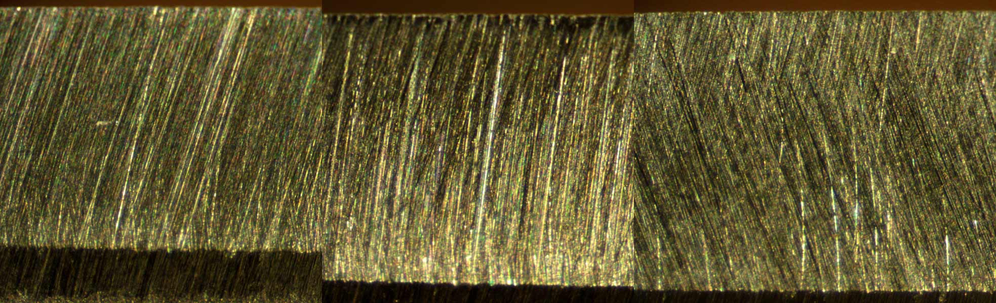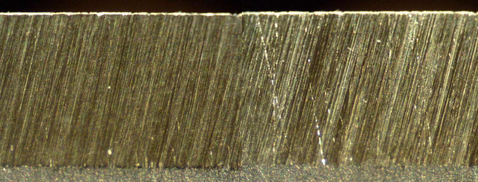 Bi-directional passes on the right, edge trailing on the left. Notice the scratches leading to the edge damage on the bi-directional passes from edge leading strokes. This is pretty common, in my experience, which is why I use edge trailing strokes. The bevel is about .075" wide.