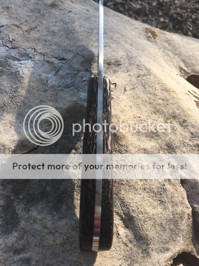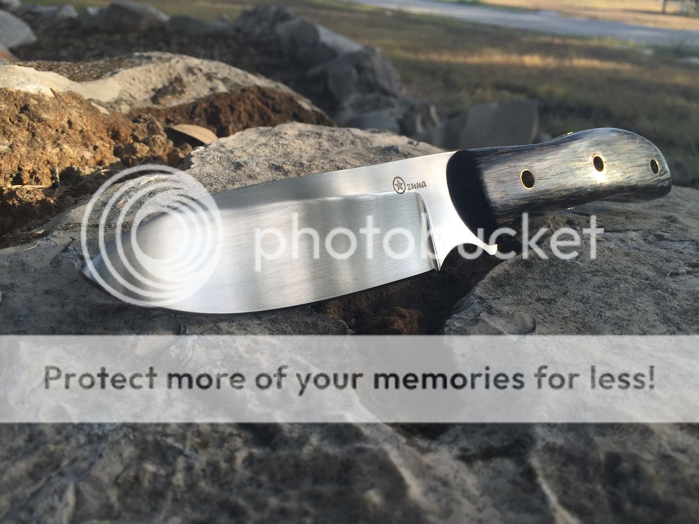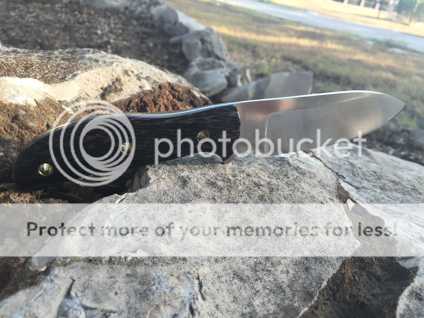Fresh off the Grinder... A new design for me.. a Stainless Bushcraft drop point and black palm scales. I made a video of this knife taking on a 2x4. After it splintered the 2x4 all to hell, the edge retention on this bad boy remained scary sharp. If your interested in this knife and would like see the video, send me your email and I will forward it to you.