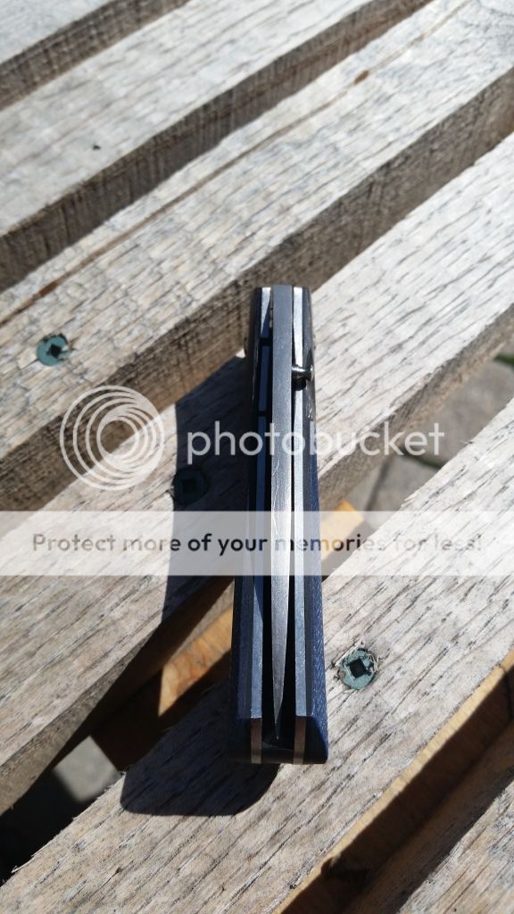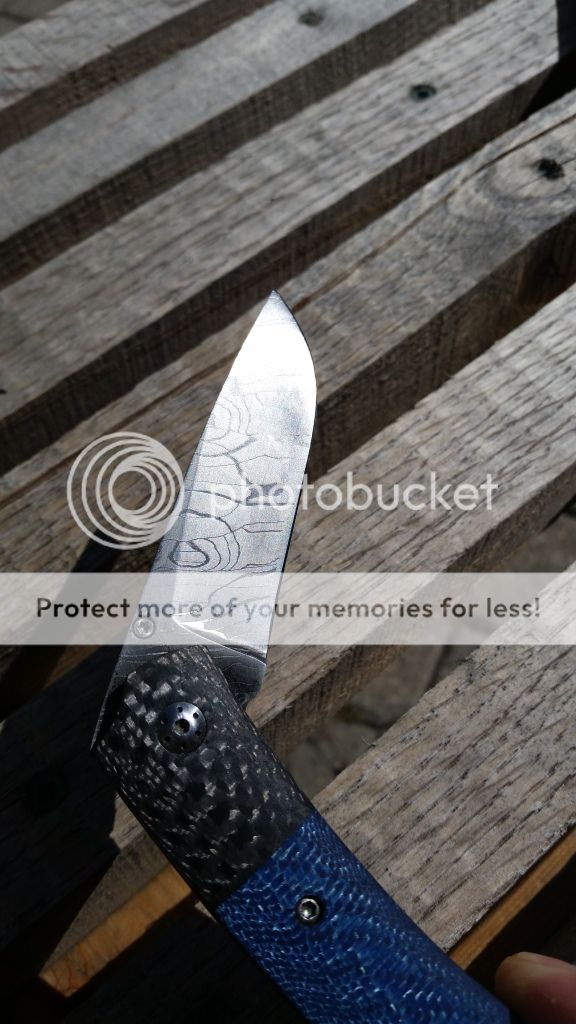 Hi, up for sale is a great folder by Eliot. Just got this direct from maker around Christmas. I'm only selling because I just bought an engagement ring and need the funds. 6 5/8 OAL, Damascus blade blue twill and carbon fiber handle. Caged bearing pivot, great lockup and centered. Had been used and carried by me. Patina and some light scratches from use. Feels great in the hand, opens/closes nice and smooth. SOLD paypal + %3.5 fees. Shipping and insurance included in price.