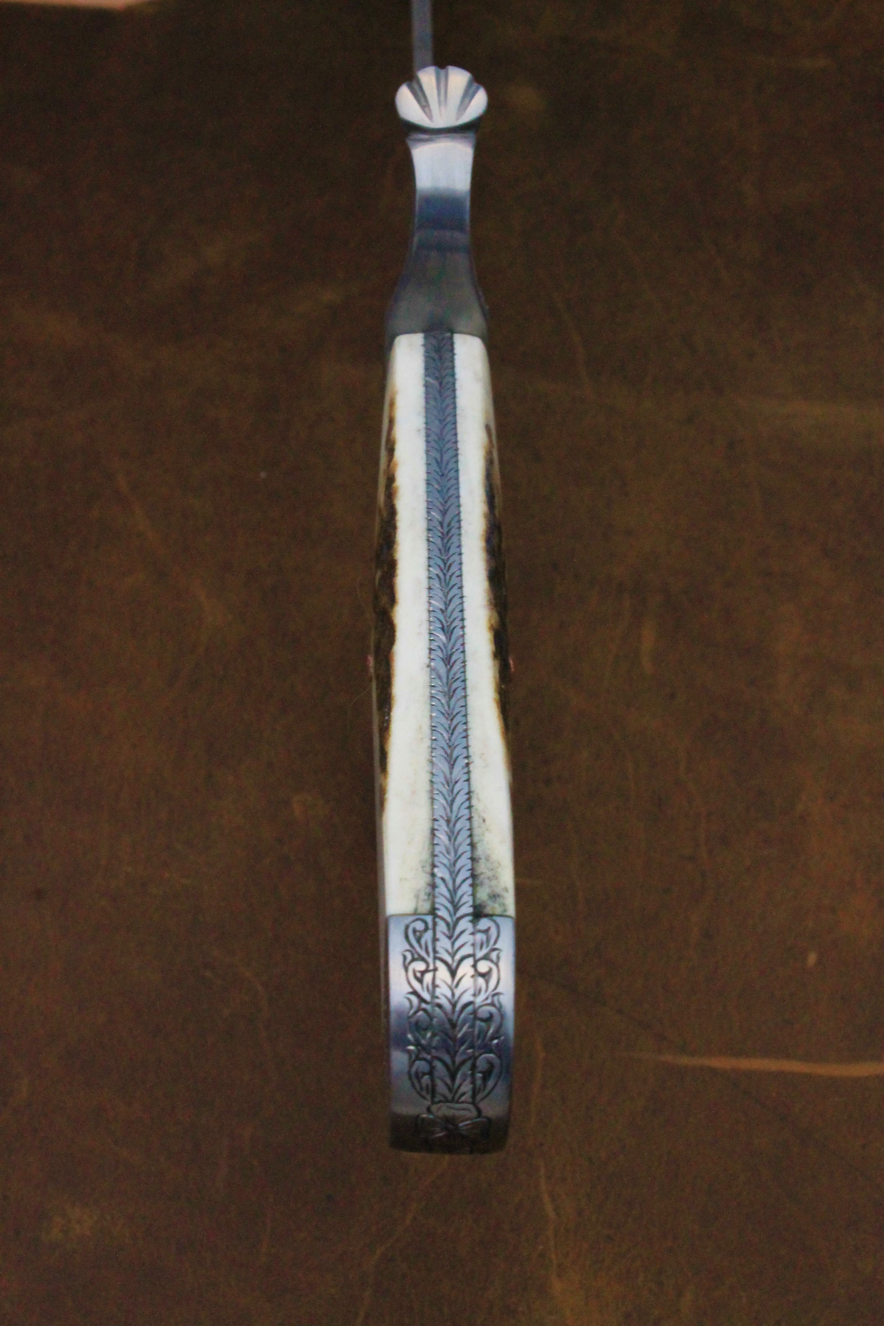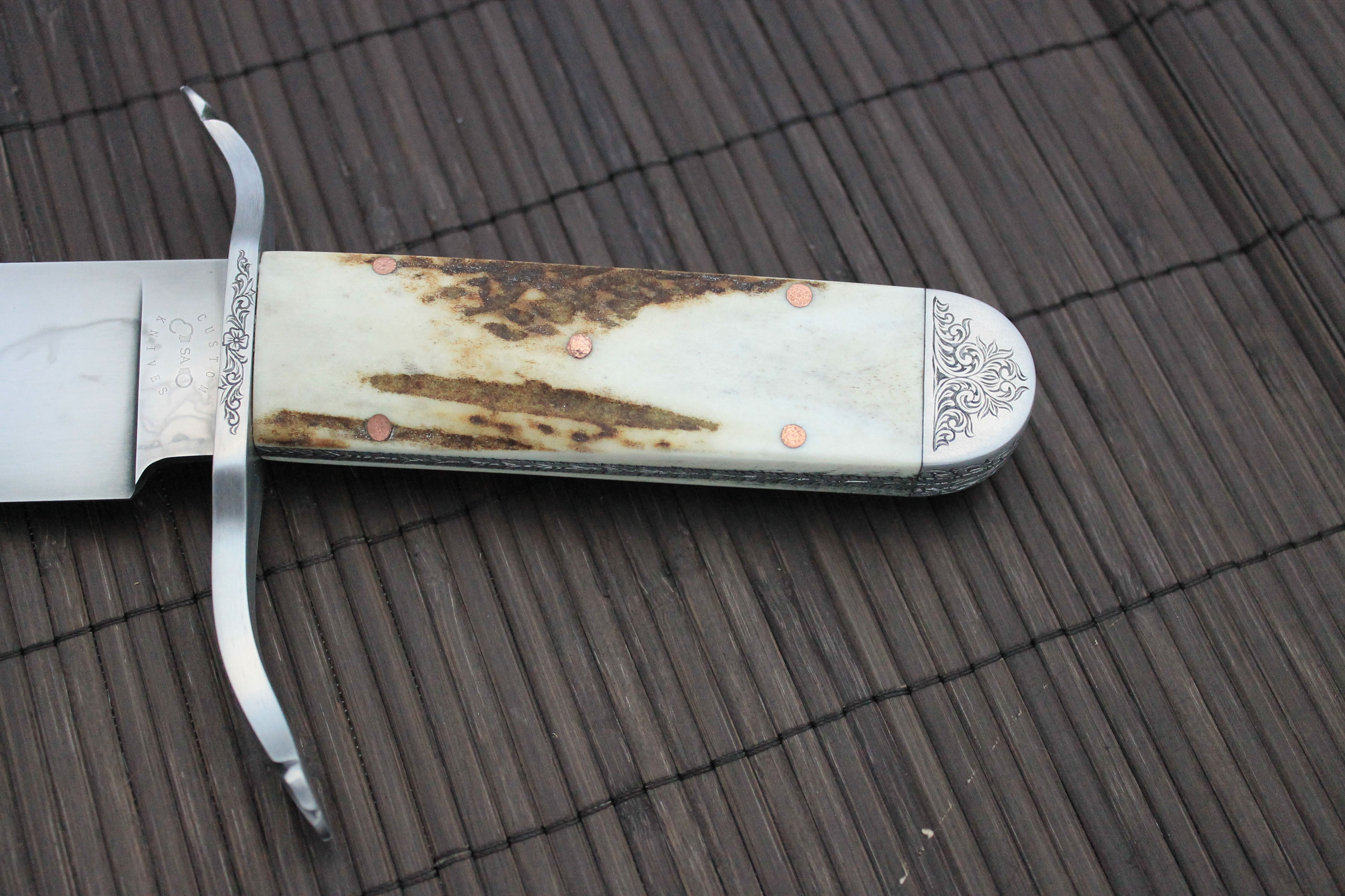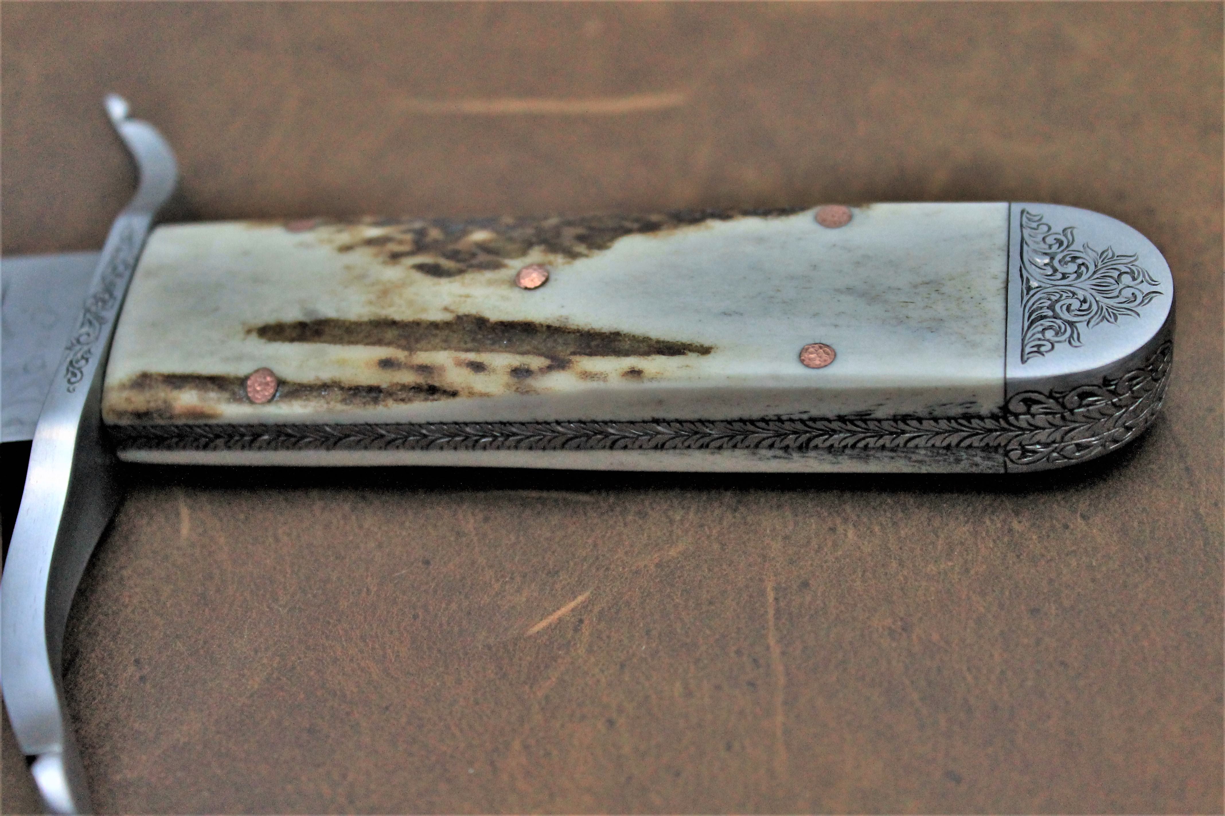 The handle scales are elk stag with textured copper pins.