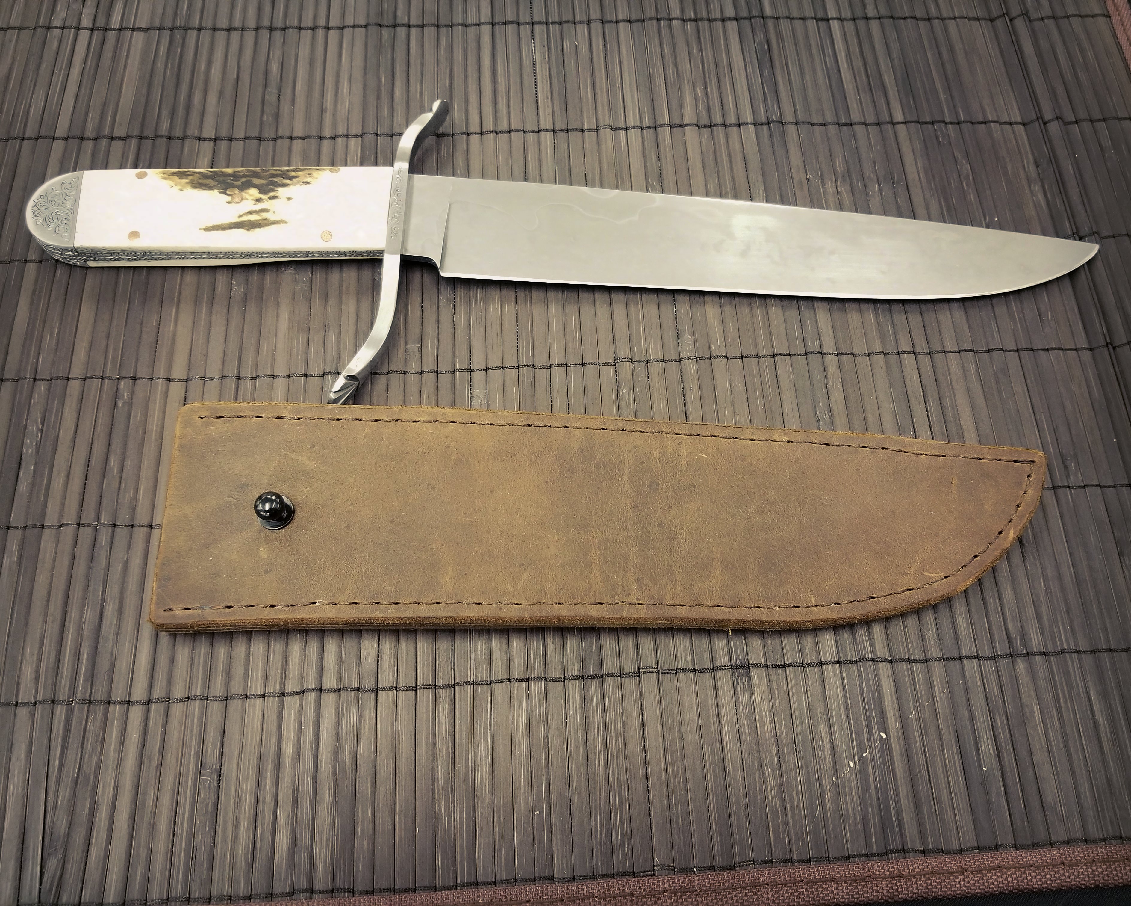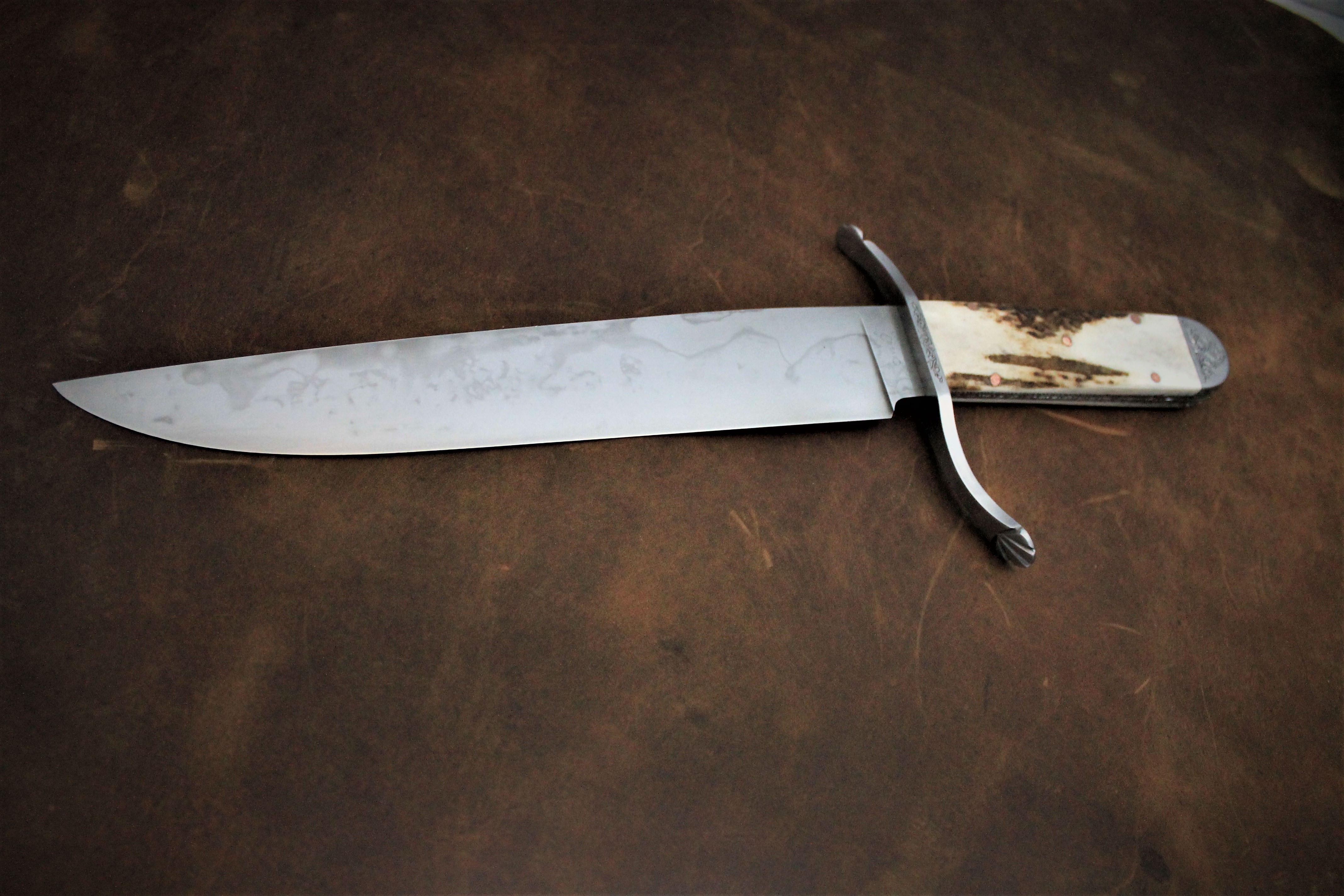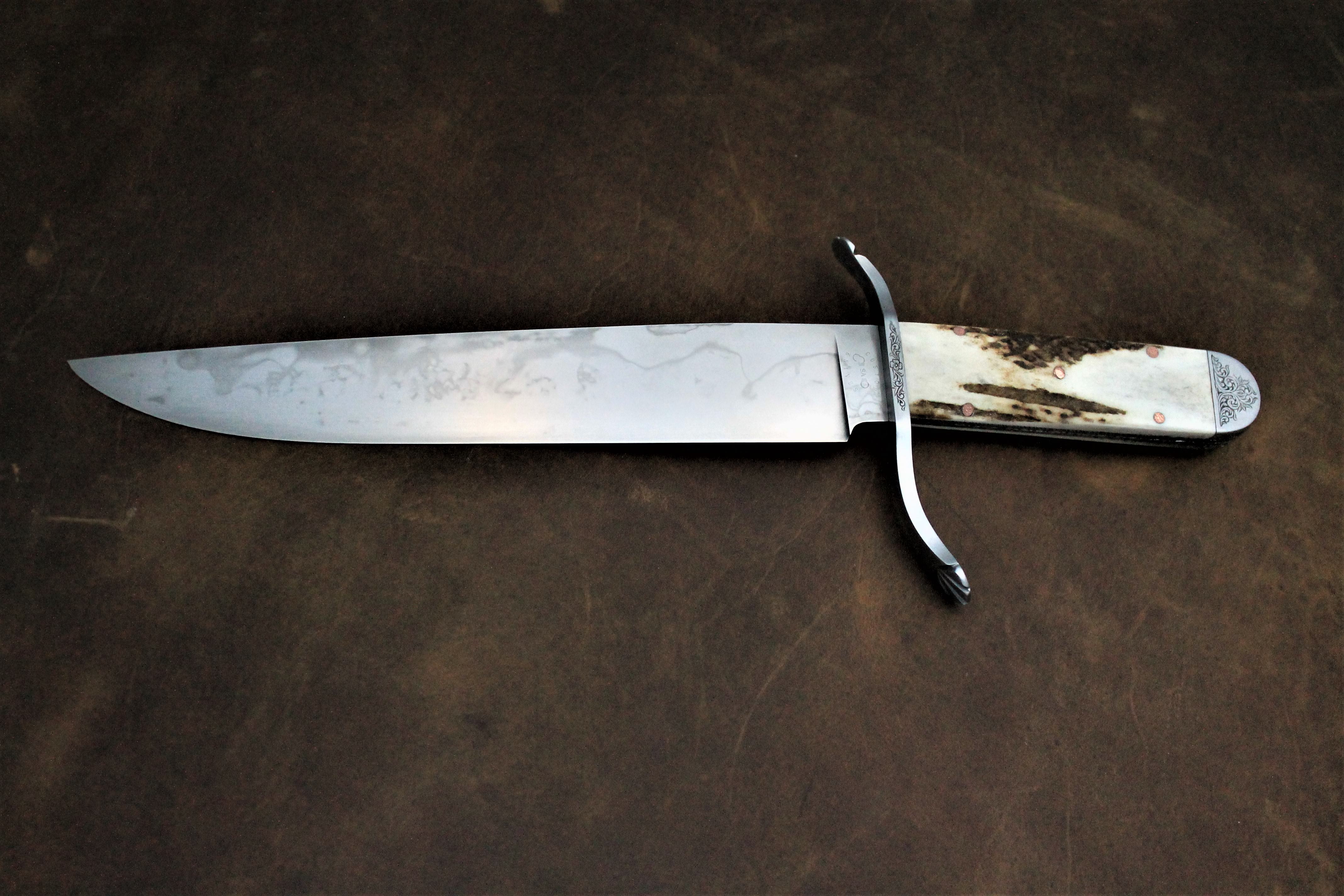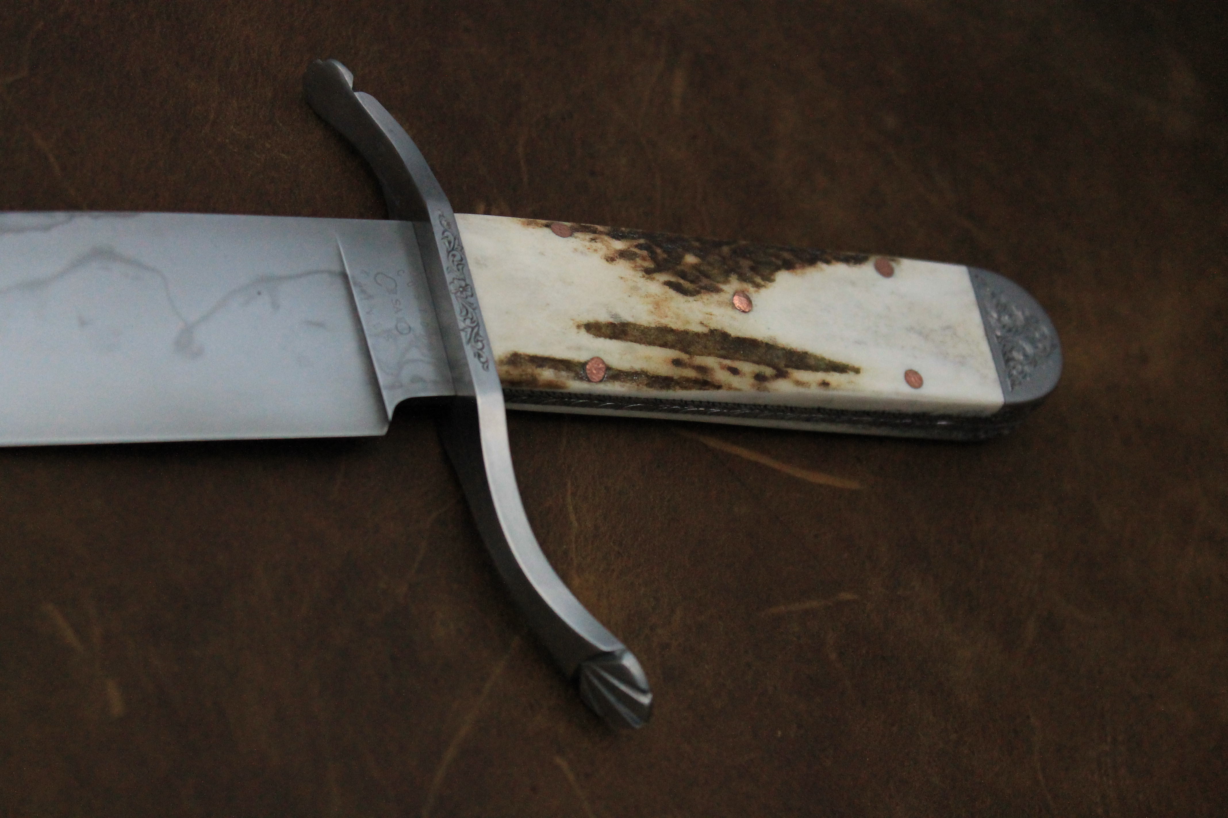 This Bowie knife is thin, lightweight, and very quick in the hand. It balances directly on the guard and feels great to swing and hold. Comes with a hand stitched leather sheath.