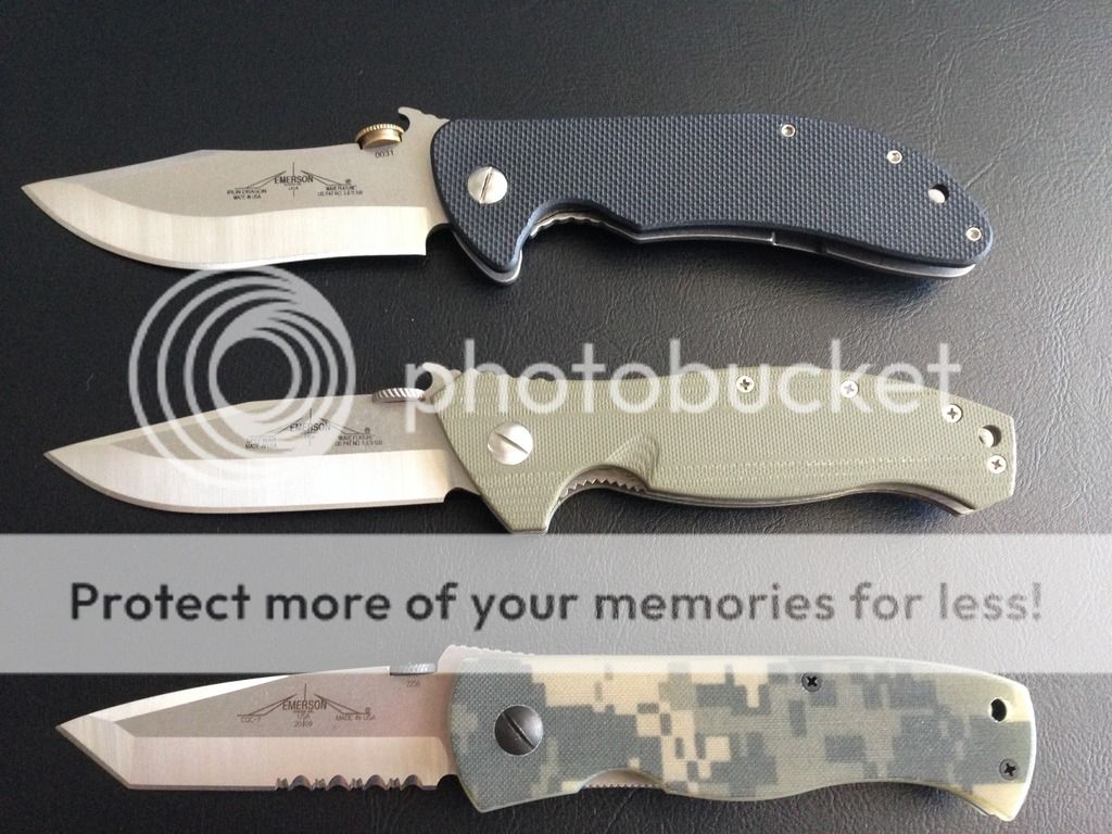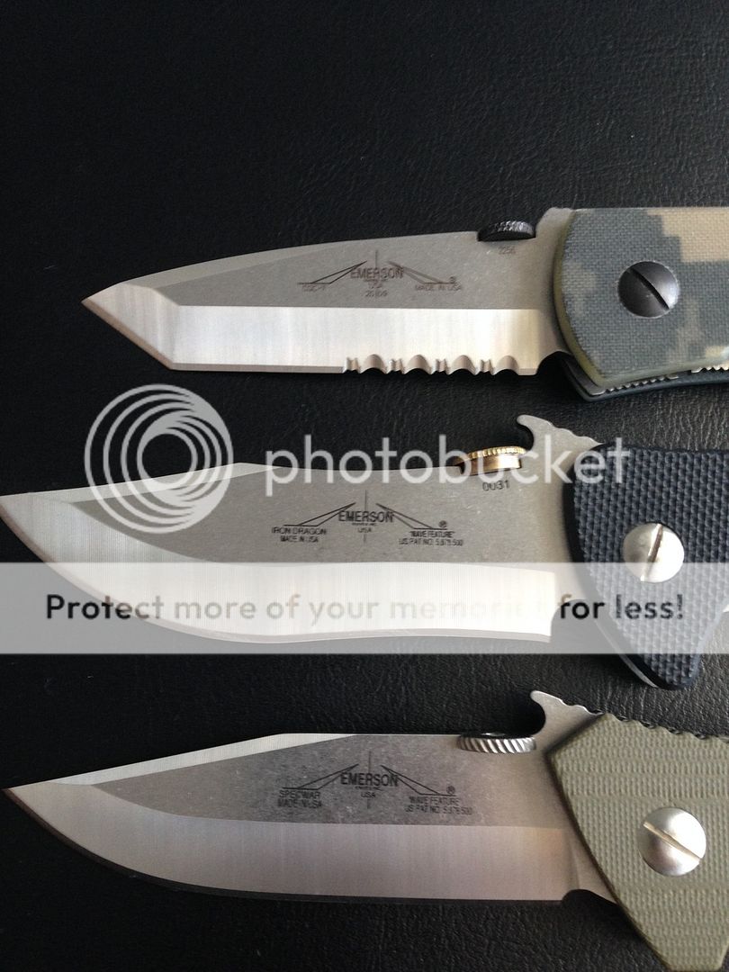 Specwar and Iron Dragon have been carried a couple times but never used to cut anything, they could pass for near mint/mint condition, solid lock up. Blades are not completely centered on both but do not come close to rubbing. Digicam 7 has been carried but not used. Screws and pivot on the 7 show signs of wear from being taken apart and cleaned. Solid lock up and centered blade. All 3 have slightly sticky lock ups but nothing out of the ordinary for most Emerson's. All will come with their stock Emerson thumb disc, but this can be negotiated as I have a few others including a zirc and ti Gray Precision and an Emerson .45.